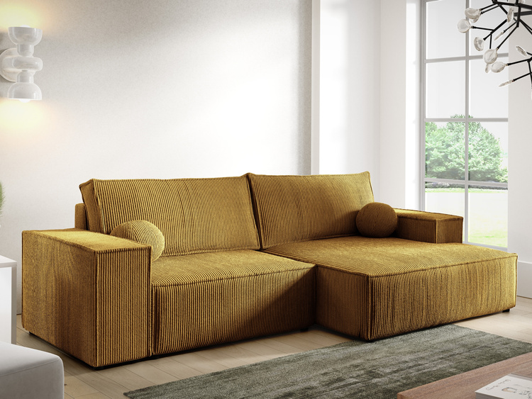 Musztardowy narożnik sztruksowy do salonu z funkcją spania LORENZO