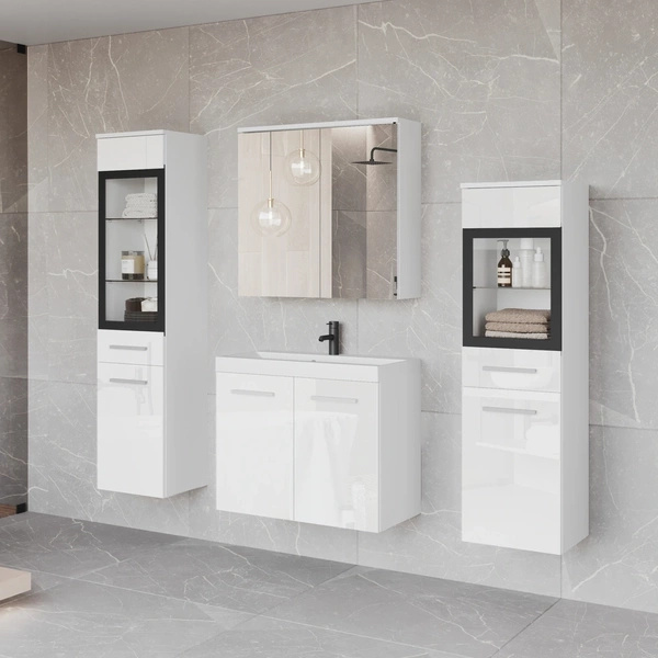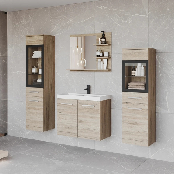 Dodatkowo zestaw zawiera szafkę z lustrem, która oferuje dwa poziomy do przechowywania. Szafka ta nie tylko dodaje przestrzeni do przechowywania, ale również optycznie powiększa wnętrze łazienki, wprowadzając do niej więcej światła.