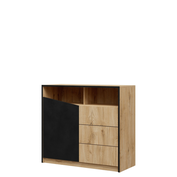 Komoda jest wyposażona w nowoczesny system otwierania "push to open", który zapewnia łatwość i wygodę użytkowania. Dwie przestronne półki wewnątrz oferują mnóstwo miejsca do przechowywania i organizacji Twoich przedmiotów.