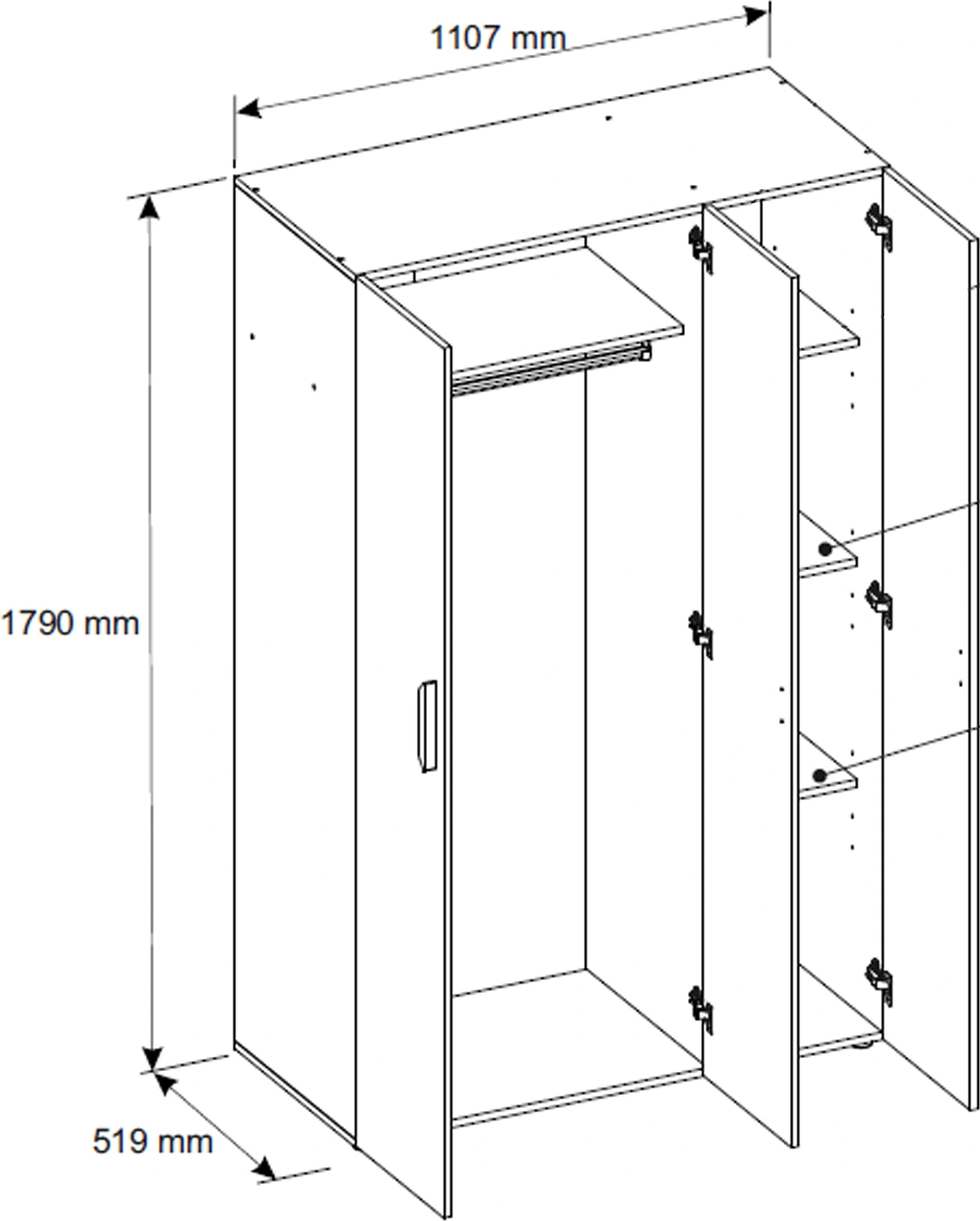 - Szafa trzydrzwiowa z drążkiem – idealna do przechowywania ubrań wiszących i złożonych