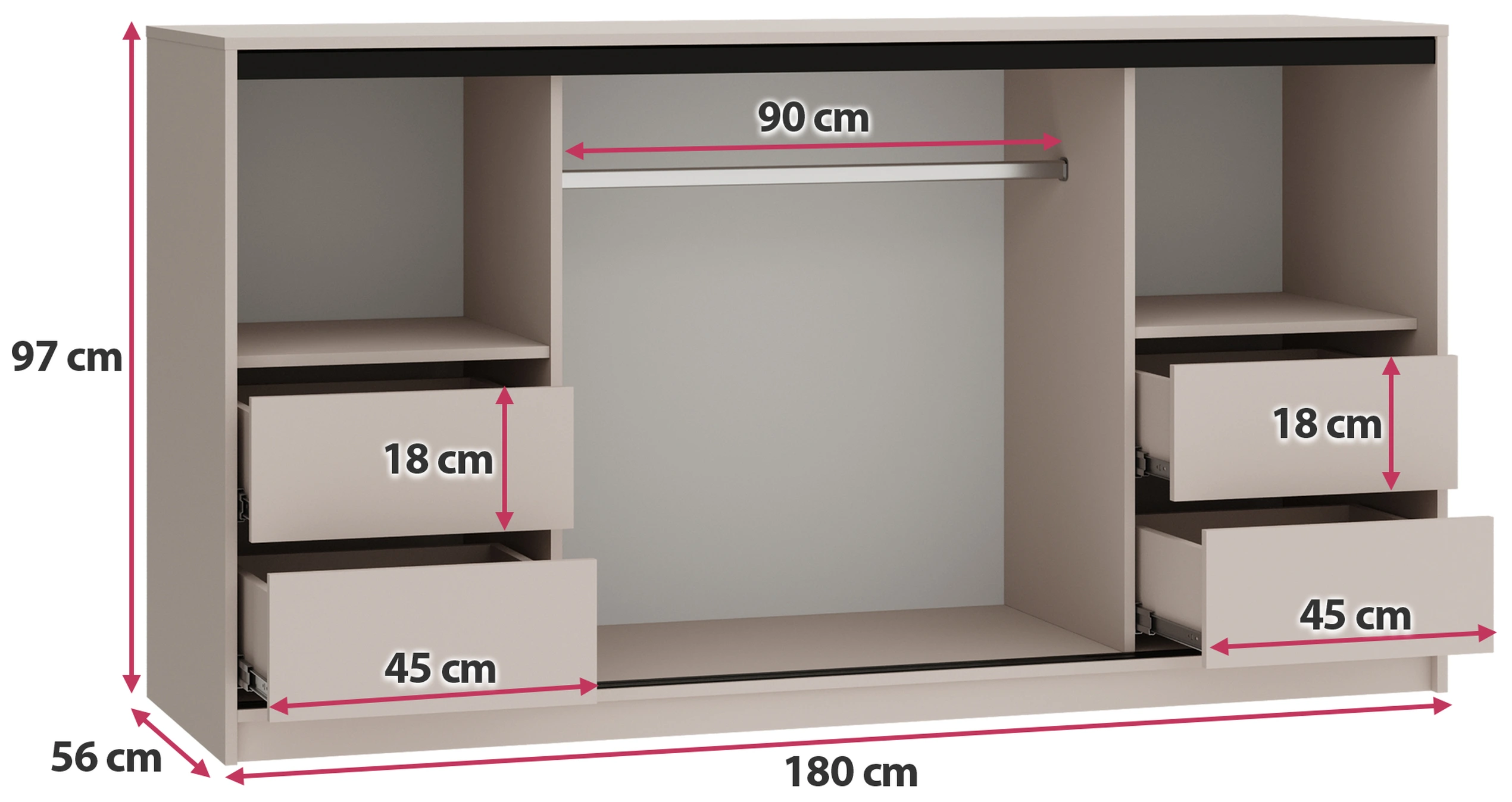 Po lewej i prawej stronie komody znajdują się po dwie pojemne szuflady, które świetnie sprawdzą się do organizacji drobiazgów lub odzieży Nad każdą z nich umieszczono półkę, która oferuje dodatkowe miejsce na większe przedmioty lub dekoracje. W środkowej części mebla znajduje się aluminiowy drążek na wieszaki, idealny do przechowywania ubrań wymagających powieszenia