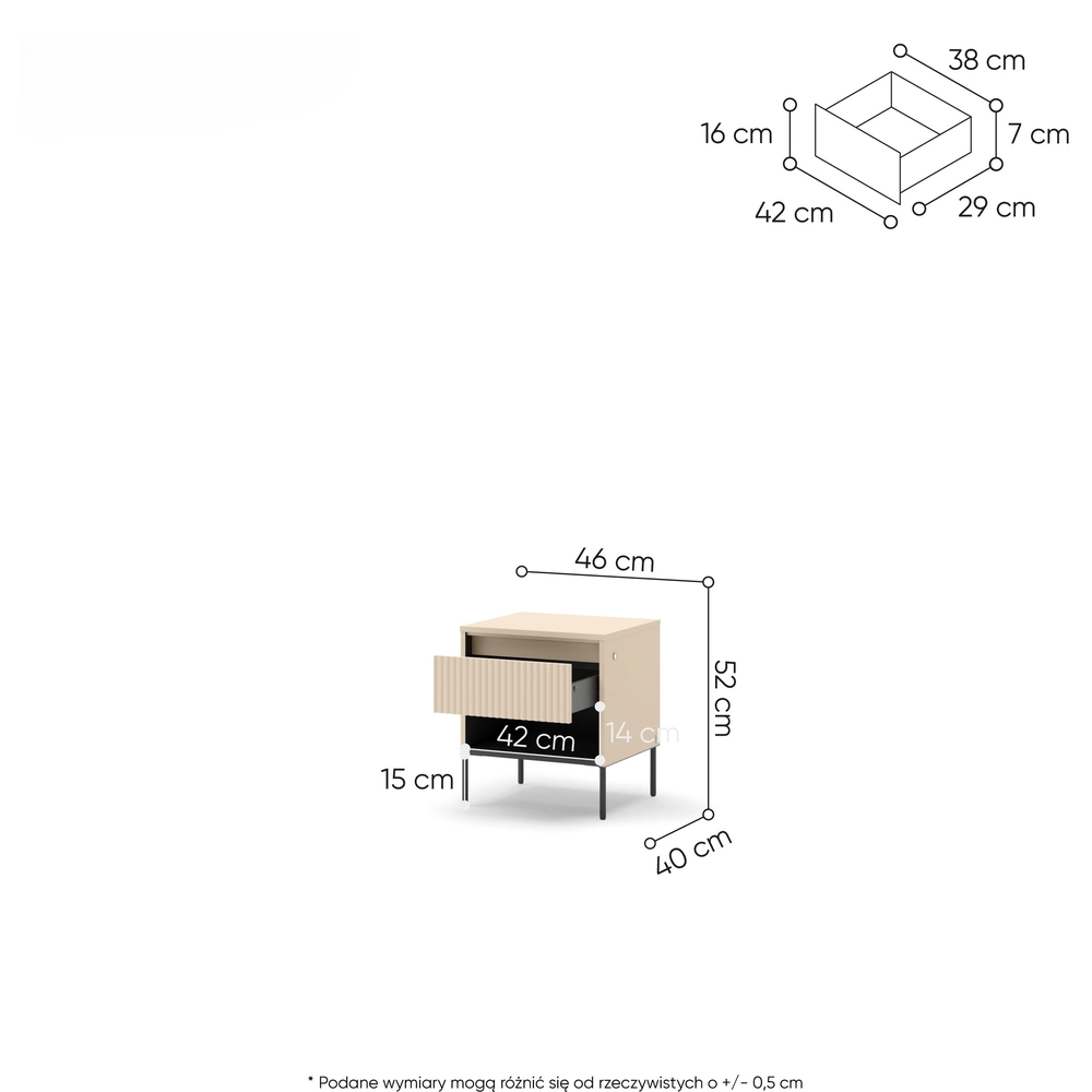 Stylowa i funkcjonalna szafka nocna TREND to idealny dodatek do nowoczesnej sypialni. Jej ryflowany front, smukłe metalowe nóżki i kontrastowa kolorystyka beżu piaskowego z czernią tworzą wyjątkowy mebel, który przyciąga wzrok. Niewielka szuflada i otwarta wnęka zapewniają miejsce na drobiazgi, które warto mieć pod ręką – od książek po ładowarkę czy okulary.