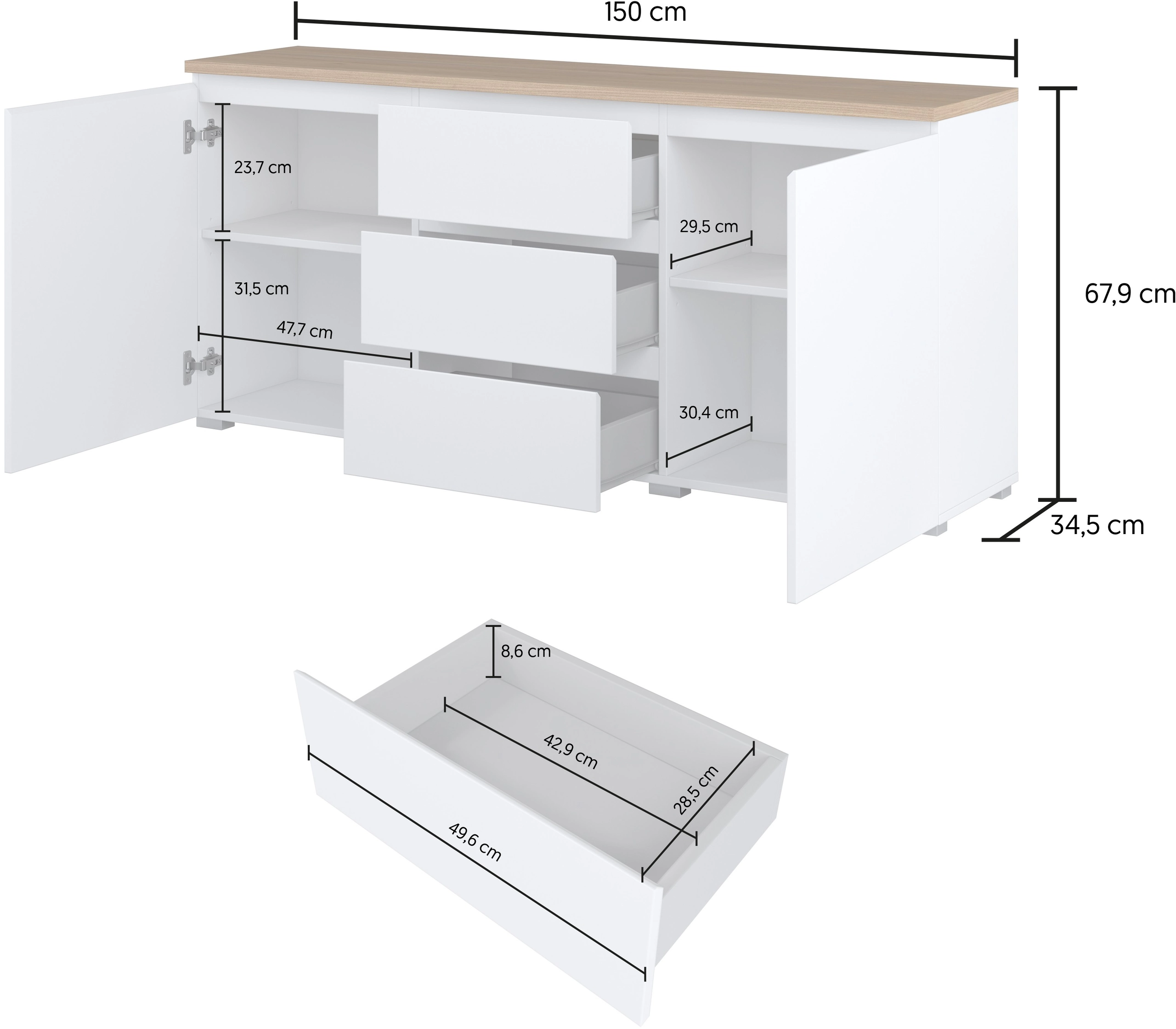 Komoda MODO z trzema pojemnymi szufladami to idealne rozwiązanie dla osób ceniących porządek, funkcjonalność i nowoczesny styl. Eleganckie połączenie bieli z blatem w dekorze dąb mauvella sprawia, że mebel wpisze się zarówno w skandynawskie, jak i minimalistyczne wnętrza. Dzięki przemyślanemu układowi szafek i szuflad, komoda sprawdzi się jako stylowy pomocnik w salonie, przedpokoju czy sypialni.