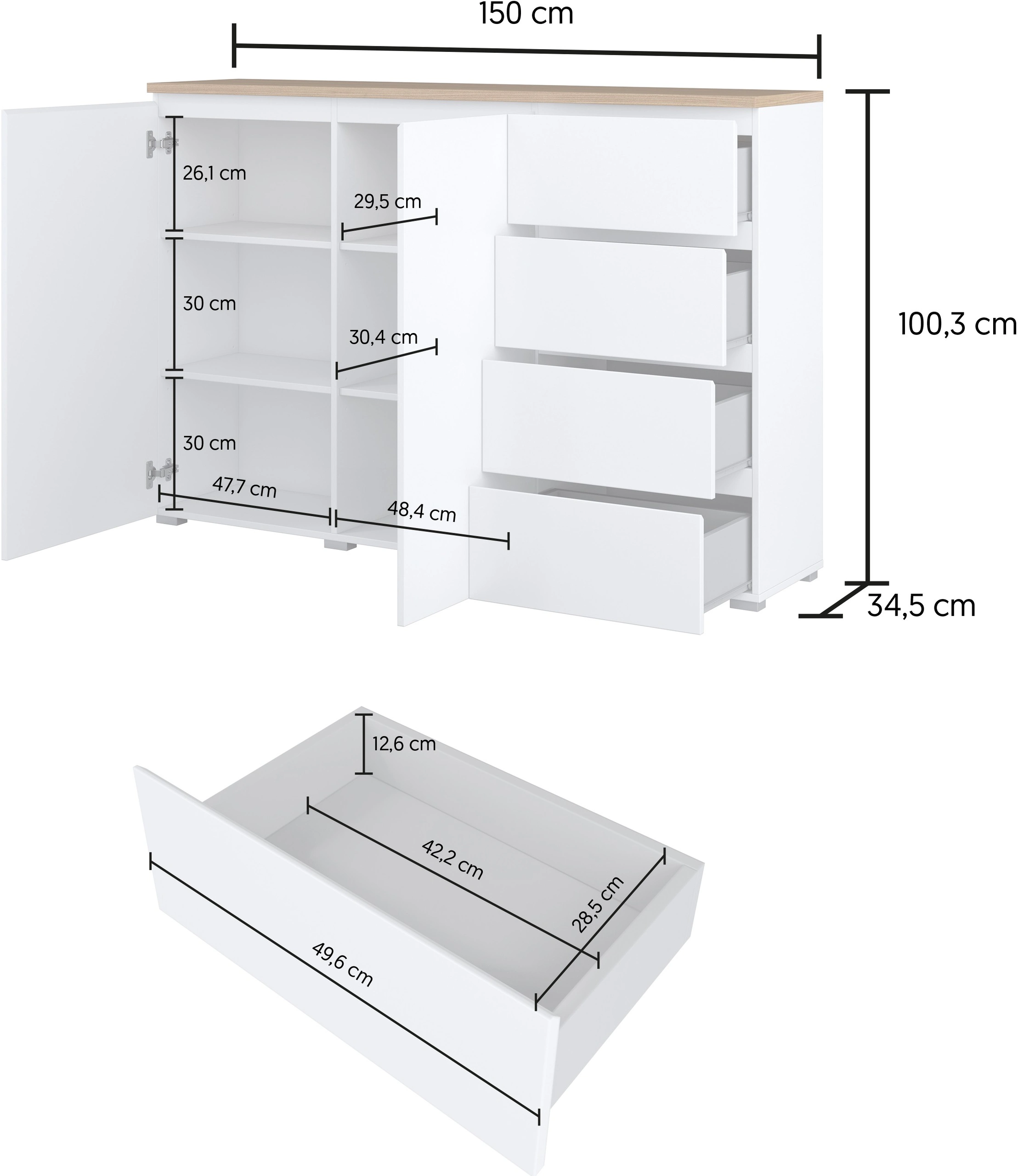 Szukasz wysokiej komody, która będzie zarówno elegancka, jak i praktyczna? MODO spełni Twoje oczekiwania! Kompaktowa szerokość 150 cm sprawia, że mebel zmieści się nawet w węższych pomieszczeniach, a zwiększona wysokość zapewnia dodatkowe miejsce na przechowywanie bez konieczności rezygnowania z estetyki.