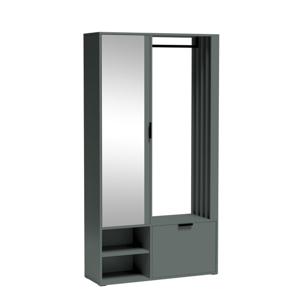 Po prawej stronie garderoby znajdziemy górną, otwartą półkę, która świetnie sprawdzi się do przechowywania torebek, kapeluszy czy innych codziennych akcesoriów. Pod nią umieszczono trzy wieszaki, które umożliwiają wygodne przechowywanie odzieży, a na samym dole garderoby znajduje się praktyczna szuflada. Szuflada osadzona jest na prowadnicach rolkowych, co gwarantuje płynne otwieranie i zamykanie, zapewniając wygodny dostęp do drobniejszych rzeczy.