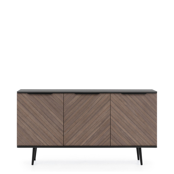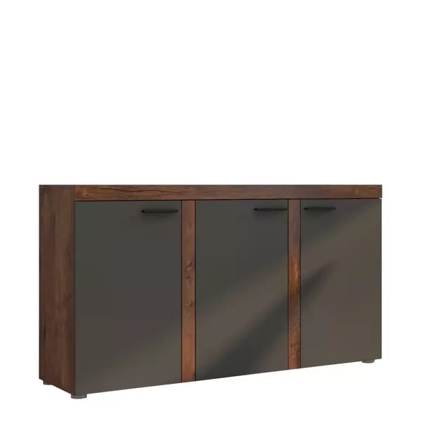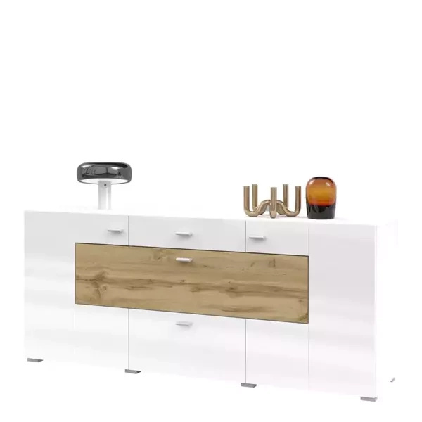 Komoda CAMBODE została wykonana w nowoczesnej stylistyce, dzięki której doskonale odnajduje się we współczesnych aranżacjach salonów, czyniąc je eleganckimi oraz niepowtarzalnymi. Komoda posiada drzwi po prawej oraz lewej stronie, gdzie za każdymi z nich znajduje się jedna półka, natomiast w jej centralnej części swoje miejsce znalazły dwie pojemne szuflady osadzone na prowadnicach rolkowych. Dodatkowo pomiędzy szufladami znajdują się drzwi uchylne, za którymi można umieścić rozmaite akcesoria.
