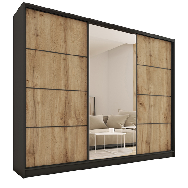 Centralną część szafy zdobi lustro, które nie tylko dodaje stylu, ale także optycznie powiększa przestrzeń, wprowadzając więcej światła do pomieszczenia. To praktyczny dodatek, który sprawdzi się zarówno w sypialni, jak i w przedpokoju.