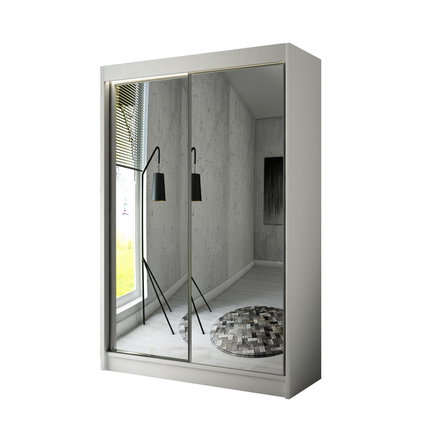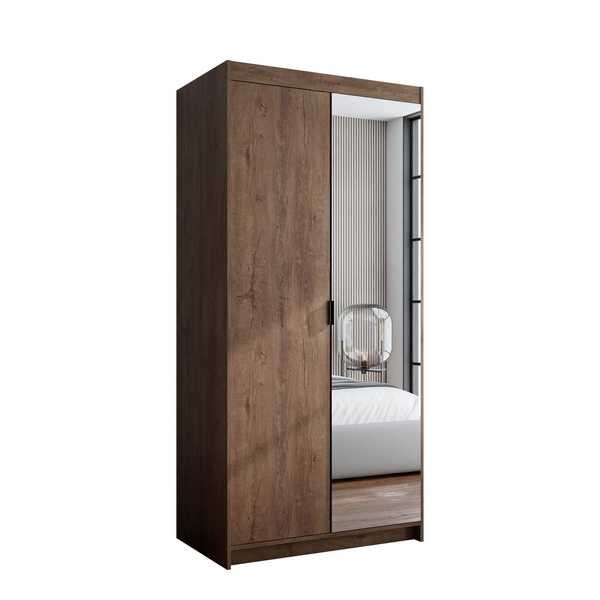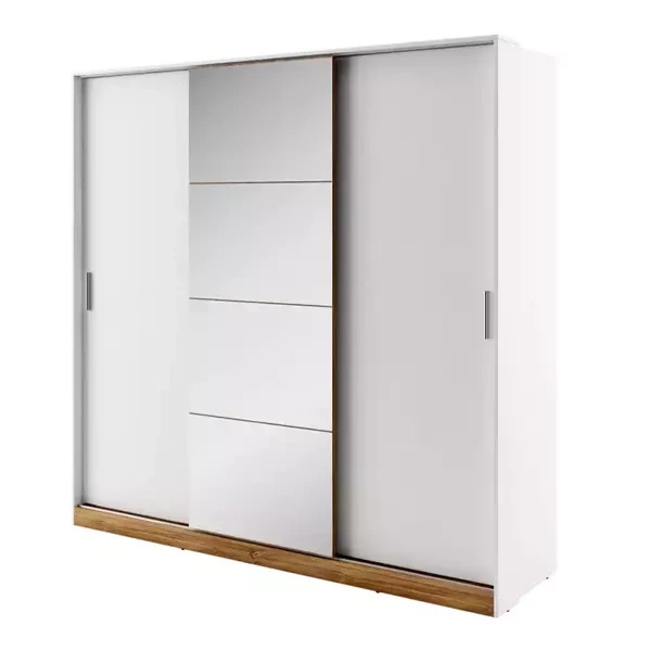 Centralną część szafy zdobi lustro, które nie tylko dodaje stylu, ale także optycznie powiększa przestrzeń, wprowadzając więcej światła do pomieszczenia. To praktyczny dodatek, który sprawdzi się zarówno w sypialni, jak i w przedpokoju.