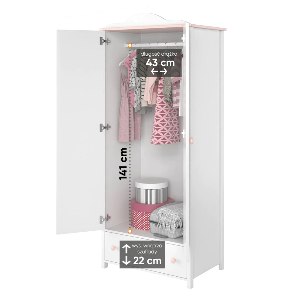Szafa do pokoju młodzieżowego LUNA posiada dwoje drzwi, za którymi znajduje się półka oraz metalowy drążek na wieszaki. Dodatkowo, w dolnej części białej szafy do pokoju dziecięcego znajduje się pojemna szuflada osadzona na prowadnicach rolkowych, która pomaga w przechowywaniu mniejszych przedmiotów i akcesoriów.