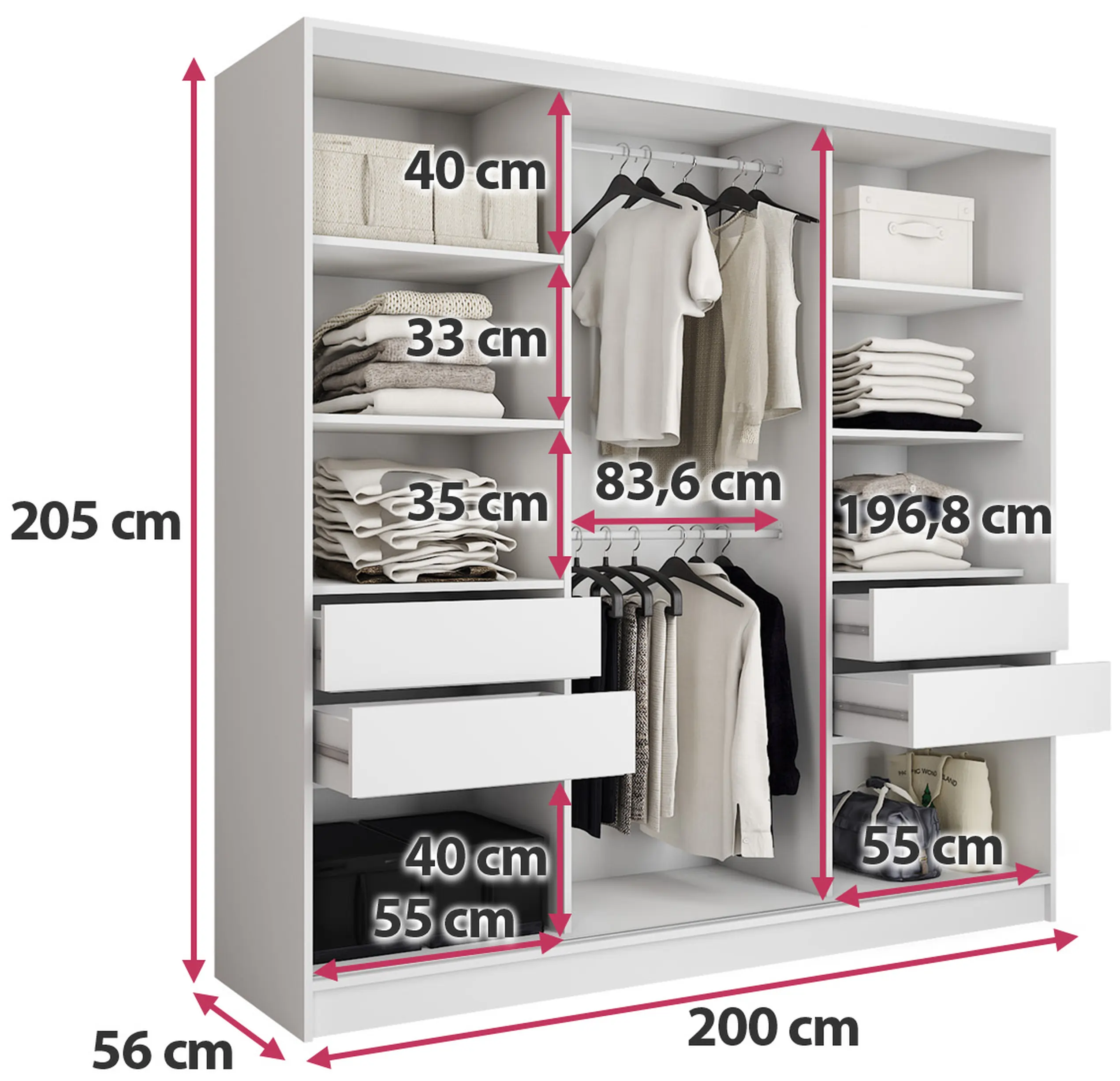 Wszystko się w niej pomieści bez problemu. Nowoczesna szafa przesuwna, prezentuje się bardzo dobrze. Łatwy i szybki montaż. Jednak wyrób z za cienkiej płyty. Przy tych gabarytach płyta 18mm spełniła by swoje zadanie. Płyta 16 mm jest stanowczo za cienka. Mimo wzmocnienia z mojej strony w narożach szafa nie jest stabilna na 100 %. Kolejna kwestia z spowalniaczami do drzwi i szuflad. Niestety ani szuflady ani drzwi nijak się mają do tych udogodnień. Dedykowane przez producenta spowalniacze drzwi nie mieszczą się , a spowalniacze szuflad nie spowalniają. Przyczyna, za ciasno chodzą prowadnice i również nijak się to ma do montażu spowalniaczy szuflady. Czyli zakup bez sensu, a miał ułatwić otwieranie i zamykanie. Reasumując, szafa w tych gabarytach warta tych pieniędzy mimo kilku niedociągnięć. Prezentuje się bardzo dobrze. Zobaczymy jak długo posłuży.