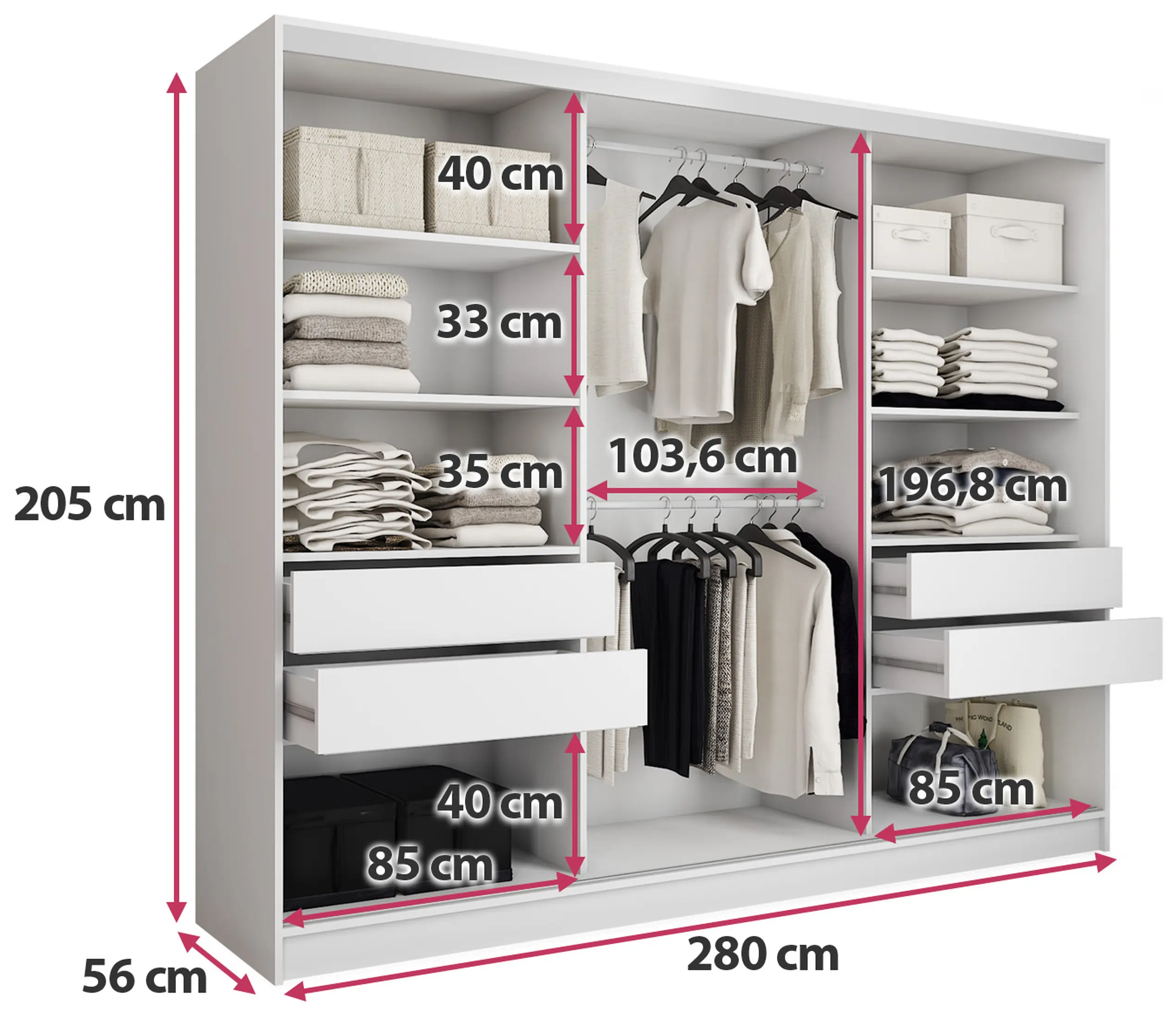 Szafa posiada trzy drzwi przesuwne osadzone na solidnej stalowej prowadnicy, z eleganckim lustrem na środkowych drzwiach, które dodaje głębi i funkcjonalności. Wnętrze szafy oferuje przemyślaną organizację przestrzeni dzięki dwóm szufladom na wytrzymałych prowadnicach kulkowych, czterem poziomom po prawej i lewej stronie oraz dwóm aluminiowym drążkom na wieszaki, idealnym do przechowywania ubrań.