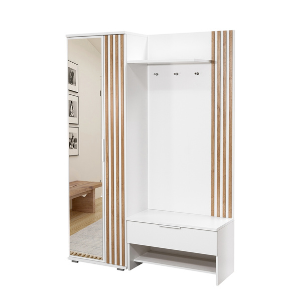 Dzięki wysokości aż 235 cm szafa oferuje wyjątkowo dużo miejsca, bez kompromisów w zakresie funkcjonalności. Dobrze rozplanowane wnętrze pozwala na logiczne uporządkowanie garderoby – od bielizny po płaszcze. Dwa aluminiowe drążki umożliwiają wygodne zawieszenie odzieży, chroniąc ją przed zagnieceniami.