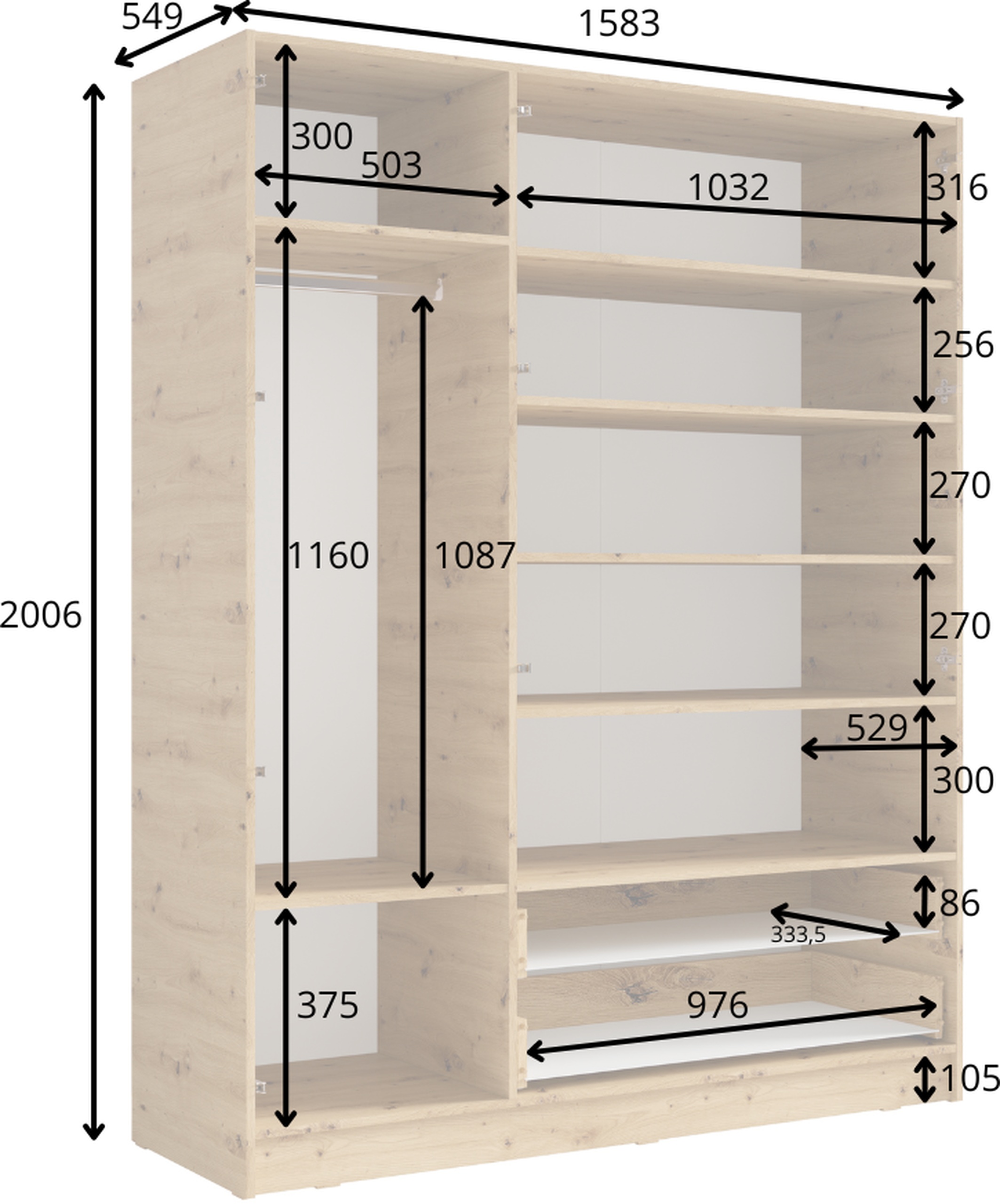 - Wymiary: szerokość 158,3 cm, wysokość 200,6 cm, głębokość 54,9 cm