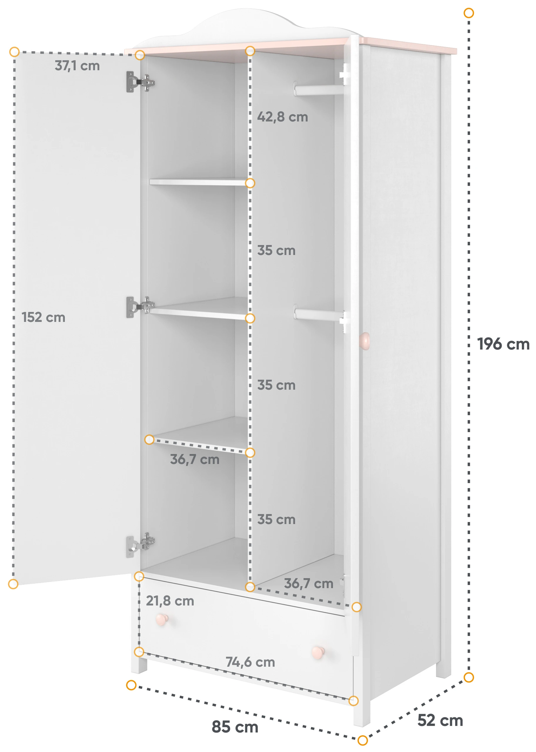 Obrzeża zabezpieczone okleiną ABS zwiększają trwałość mebla. Jedną z największych zalet szafy dziecięcej jest jej pojemność. Dzięki trzem półkom oraz dwóm drążkom na wieszaki, szafa umożliwia przechowywanie różnych rodzajów ubrań, takich jak np. spodnie, koszule czy bluzki. Szuflada natomiast stanowi idealne miejsce na przechowywanie drobnych przedmiotów, takich jak np. biżuteria czy drobiazgi. Kolejną zaletą szafy dziecięcej jest jej funkcjonalność.