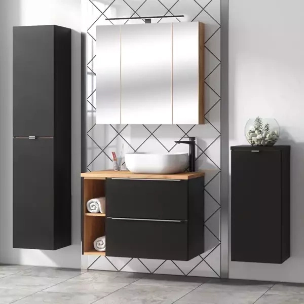 Białe szafki łazienkowe na wysoki połysk wzbogacone wstawkami w kolorze dąb craft złoty, pomogą zaaranżować łazienkę w stylu nowoczesnym. Przytulne, rustykalne wnętrze w łazience uzyskasz z pomocą szafek łazienkowych w drewnopodobnym dekorze dąb craft złoty, a czarne, matowe fronty będą zwieńczeniem łazienki loftowej. Kolekcja Charm zawiera 9 szafek wiszących, które możesz zestawiać jedna z drugą, tak aby stworzyć zestaw mebli do łazienki. Dostępne są; słupki łazienkowe z pięcioma półkami zamykanymi oraz wysokie szafki z półkami zamykanymi, z dodatkowymi szklanymi półkami po bokach, wzbogacone lustrem na froncie; Szafki bez frontów, na których ułożysz dopasowane kolorystycznie do wnętrza ręczniki; szafki z koszem cargo, które będą idealnym miejscem na brudne ubrania oraz szafki pod umywalkę. Szafki wyposażone są w zawiasy z cichym domykiem i metalowe uchwyty krawędziowe.