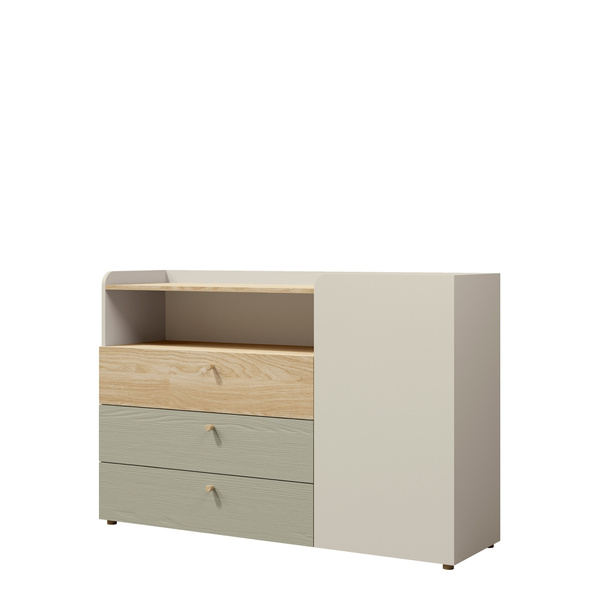 Krawędzie mebla wykończono obrzeżem ABS, co skutecznie zabezpiecza przed uszkodzeniami i wilgocią, zapewniając długotrwałą estetykę mebla.
