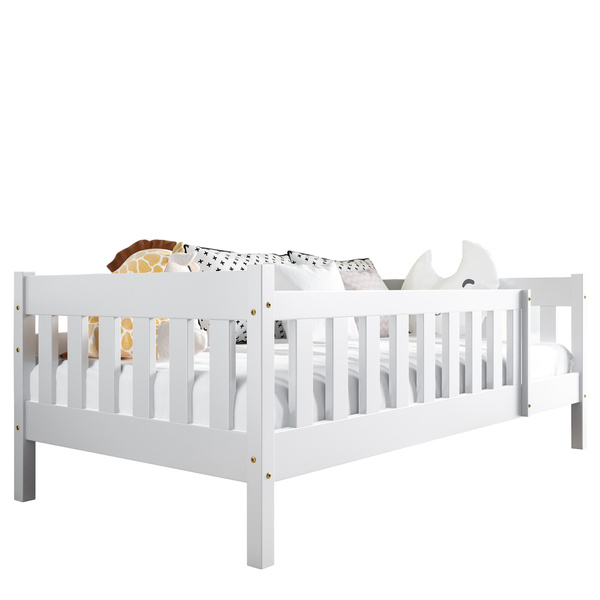 - Łóżko dziecięce wykonane z drewna sosnowego. Drewno sosnowe jest cenione za swoją trwałość i solidność, co gwarantuje, że łóżko posłuży przez wiele lat. Ten wariant występuję w wybarwieniu białym.