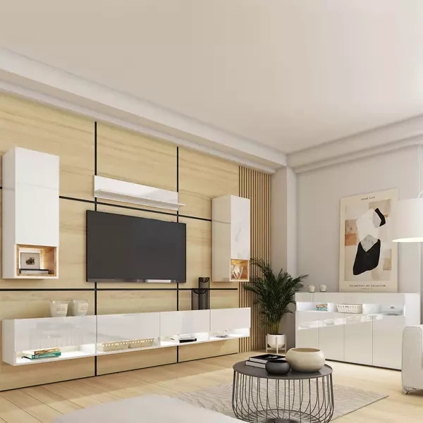Szafa jednodrzwiowa uzupełnia zestaw, dostarczając dodatkowej przestrzeni do przechowywania w eleganckim, minimalistycznym stylu. Biała powierzchnia błyszczy czystością, a wewnątrz znajduje się więcej niż wystarczająco miejsca na Twoje skarby.