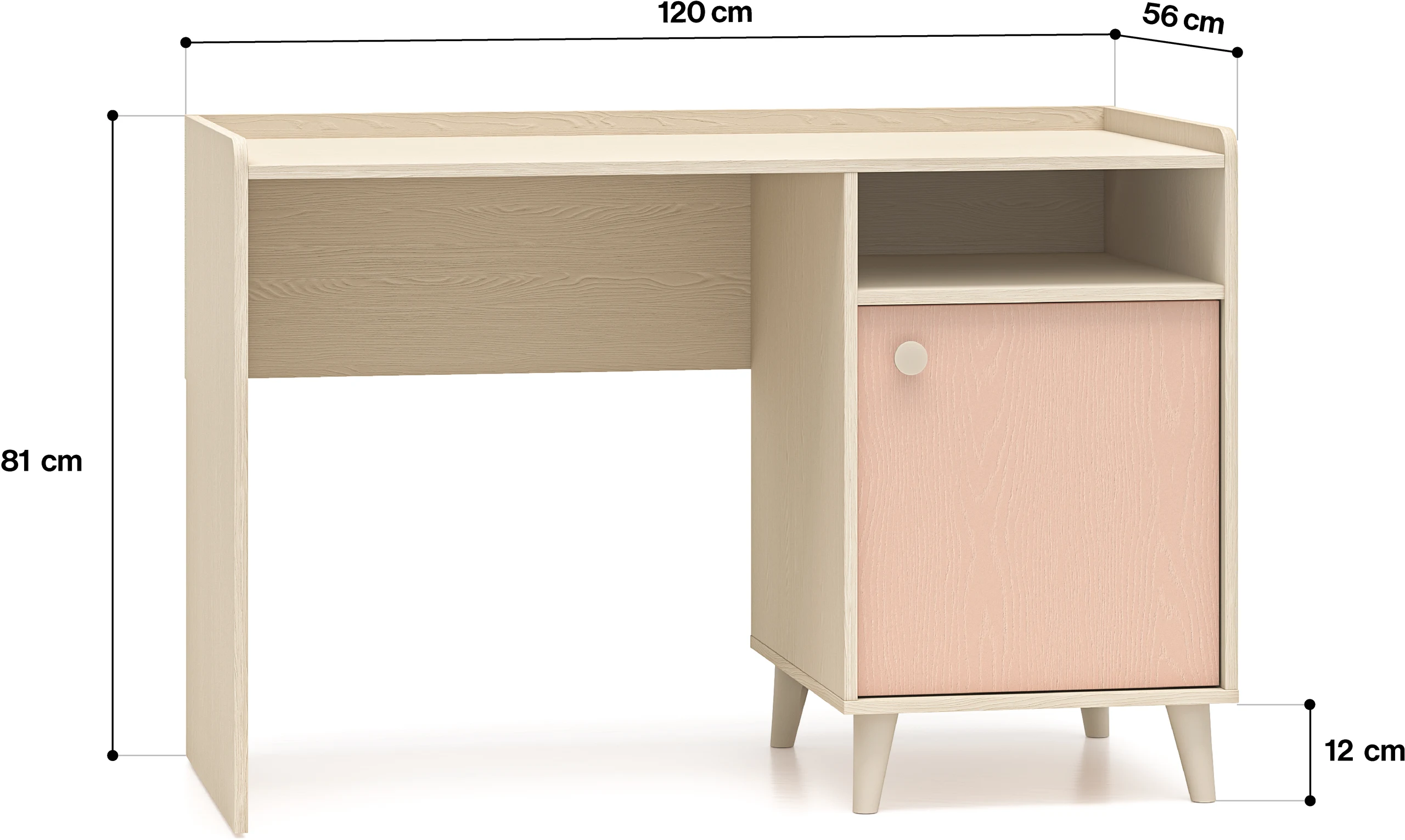 Biurko MERLO to funkcjonalny i estetyczny mebel, który idealnie sprawdzi się w pokoju dziecka lub nastolatka. Połączenie korpusu w kolorze piasek pustyni z frontem w odcieniu millennial pink wprowadza do wnętrza lekkość, ciepło i subtelny, pastelowy charakter sprzyjający nauce oraz kreatywności.