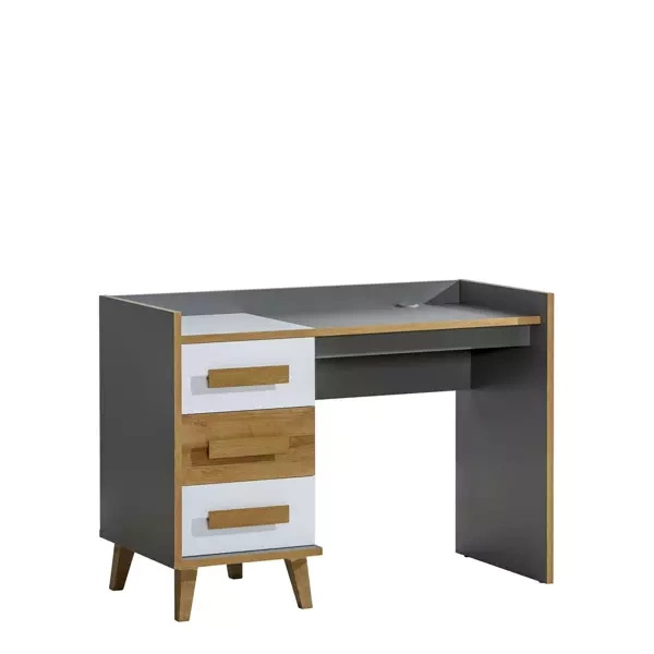 Biurko młodzieżowe z kolekcji mebli systemowych PRESSCOT stanowiące idealne miejsce pod komputer czy czytania książek. Biurko zostało wyposażone we dwie pojemne szuflady u spodu, oraz szafkę zamykaną drzwiami, gdzie możesz umieścić najpotrzebniejsze rzeczy i zyskać szybki dostęp, świetnym rozwiązaniem jest wnęka pod blatem, dzięki której niezbędniki biurkowe będą zawsze w zasięgu twojej ręki.