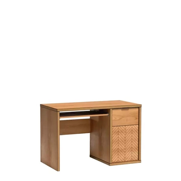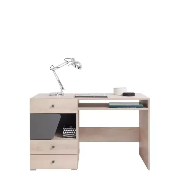 Biurko wyróżnia się unikatowym wybarwieniem, które łączy w sobie dwa odcienie: sosnę andersen i dąb nash. Korpus wykonany jest z płyty laminowanej o grubości 16 mm w kolorze sosny andersen, co dodaje meblowi lekkości i świeżości. Blat biurka, o grubości 25 mm, prezentuje się w eleganckim odcieniu dąb nash, tworząc harmonijną kompozycję kolorystyczną. Takie połączenie barw wprowadza do wnętrza ciepłą, domową atmosferę, jednocześnie zachowując profesjonalny charakter.