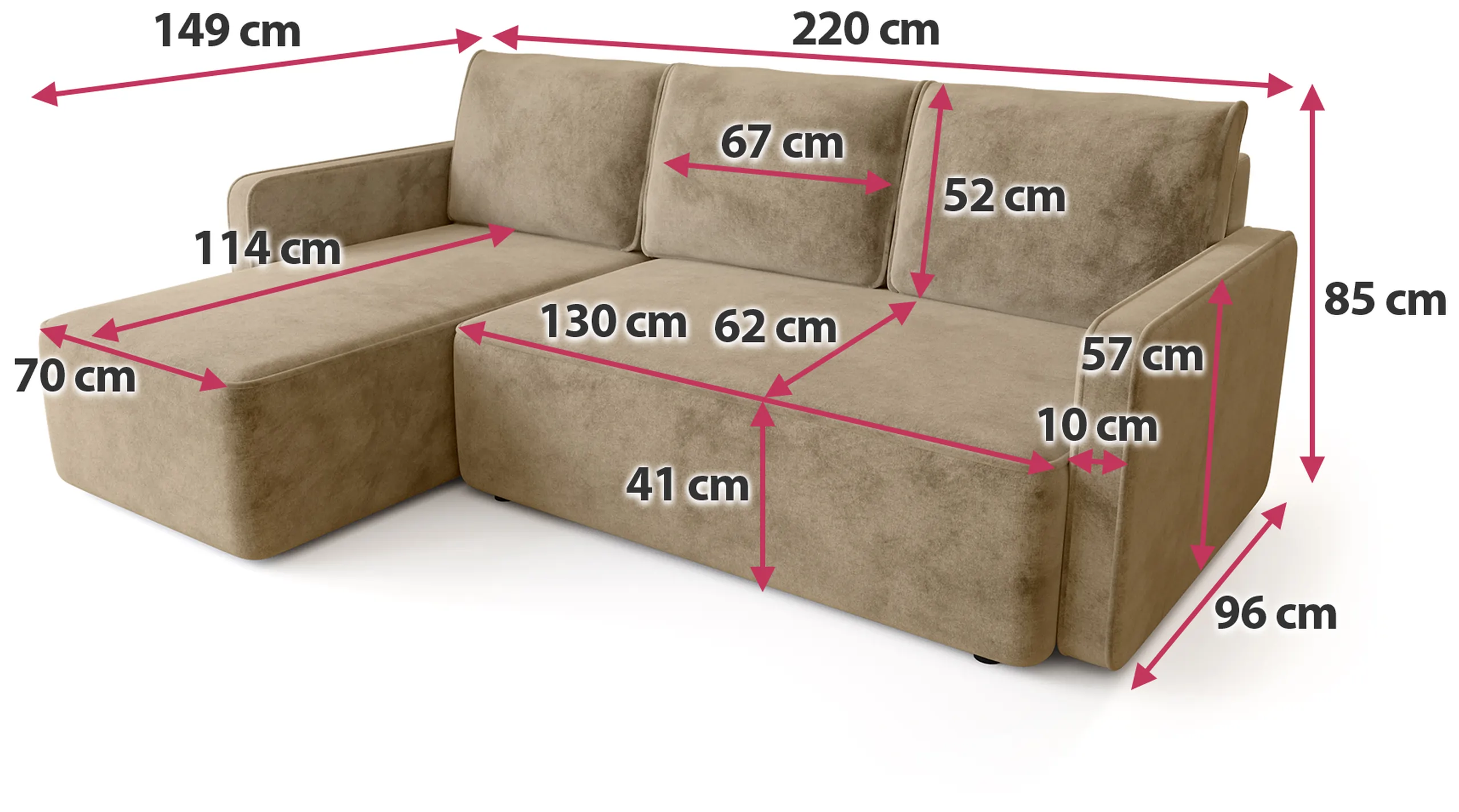 Zaproś do swojego salonu styl i funkcjonalność w najlepszym wydaniu. Ten narożnik to idealne połączenie komfortu, nowoczesnych rozwiązań i eleganckiego wyglądu. Dzięki funkcji spania o wymiarach 130x200 cm oraz zastosowaniu automatu DL, rozkładanie narożnika staje się szybkie i bezproblemowe. Siedzisko oparte na sprężynach falistych i piance PUR gwarantuje wygodę na najwyższym poziomie, a trzy grube poduchy oparciowe zapewniają optymalne wsparcie pleców podczas codziennego wypoczynku.