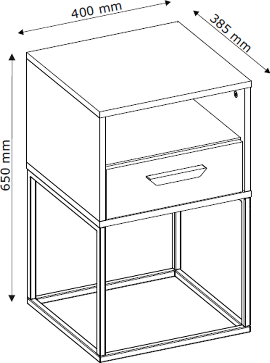 Szafka nocna do sypialni COTTA to idealne połączenie minimalistycznego designu i codziennej praktyczności. Wykonana z trwałej płyty laminowanej i osadzona na czarnych metalowych nóżkach, wprowadza do wnętrza nowoczesną elegancję. Dzięki szufladzie i półce zyskujesz wygodne miejsce na przechowywanie najpotrzebniejszych drobiazgów – wszystko w zasięgu ręki, tuż obok łóżka.