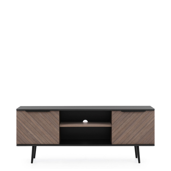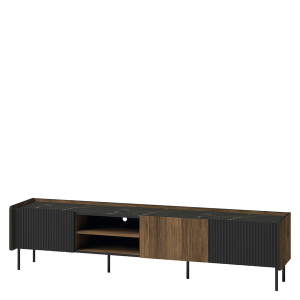 Szafka RTV o długości 180 cm została zaprojektowana z myślą o maksymalnym wykorzystaniu przestrzeni. Wyposażona w jedną pojemną szufladę oraz dwoje drzwi, oferuje dużo miejsca na przechowywanie niezbędnych akcesoriów RTV, jak piloty, kable czy kolekcje filmów i gier. Metalowe nóżki o wysokości 13,5 cm nadają meblowi nowoczesnego charakteru i zapewniają stabilność.