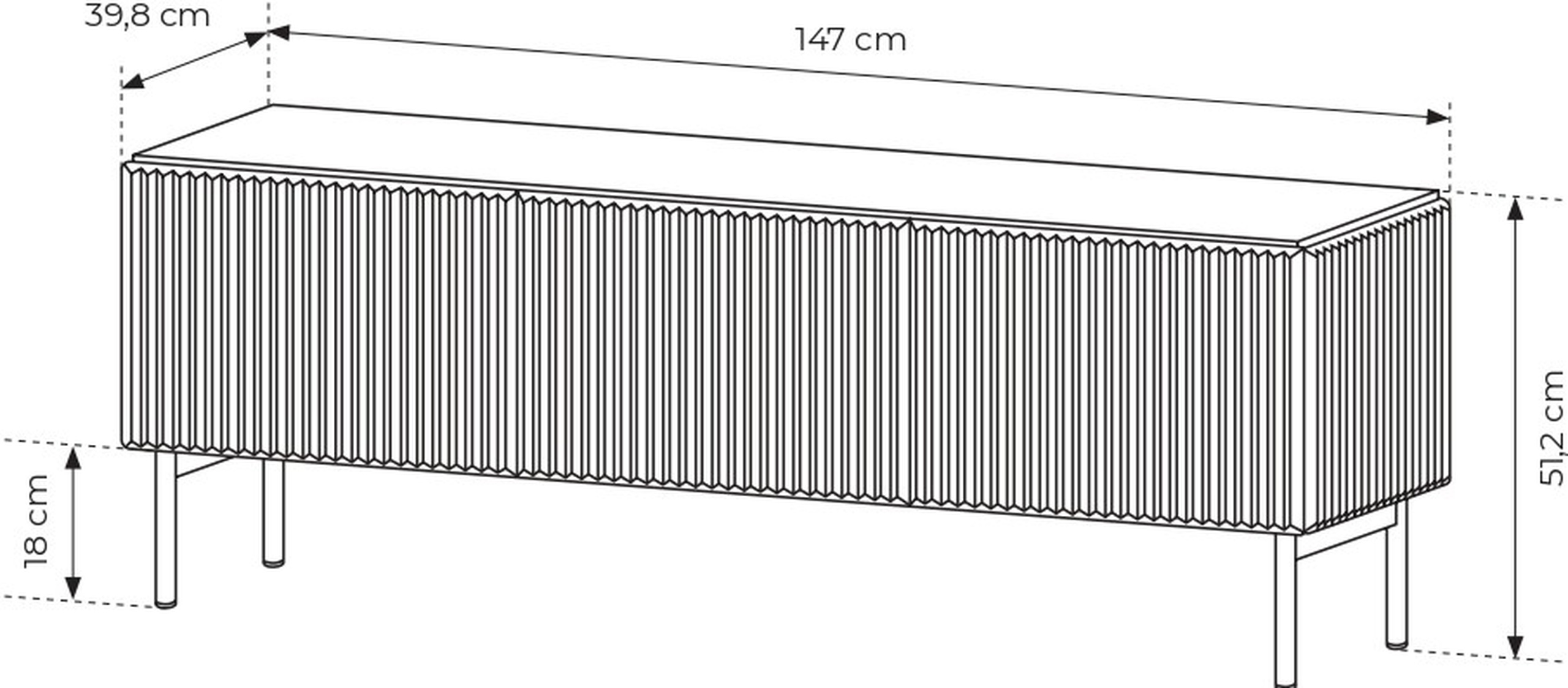 Ta szafka RTV to doskonały wybór do salonu, w którym liczy się estetyka i porządek. Matowe, czarne wykończenie harmonizuje z subtelną strukturą ryflowanej płyty MDF, tworząc spójną i luksusową całość. Dzięki wysokości 51,2 cm mebel nie dominuje przestrzeni, a jednocześnie oferuje wygodną powierzchnię użytkową.