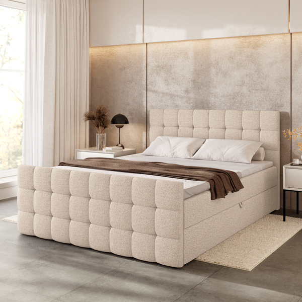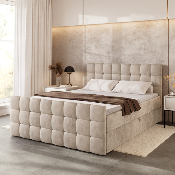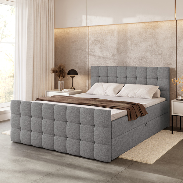 Łóżko kontynentalne 140x200 cm DAKOTA DUO to idealne rozwiązanie dla osób, które szukają połączenia nowoczesnego designu z codziennym komfortem. Model ten wyróżnia się podwójnym zagłówkiem o dekoracyjnym układzie równo pikowanych kwadratów – dzięki niemu całość prezentuje się niezwykle elegancko i harmonijnie w każdej sypialni.