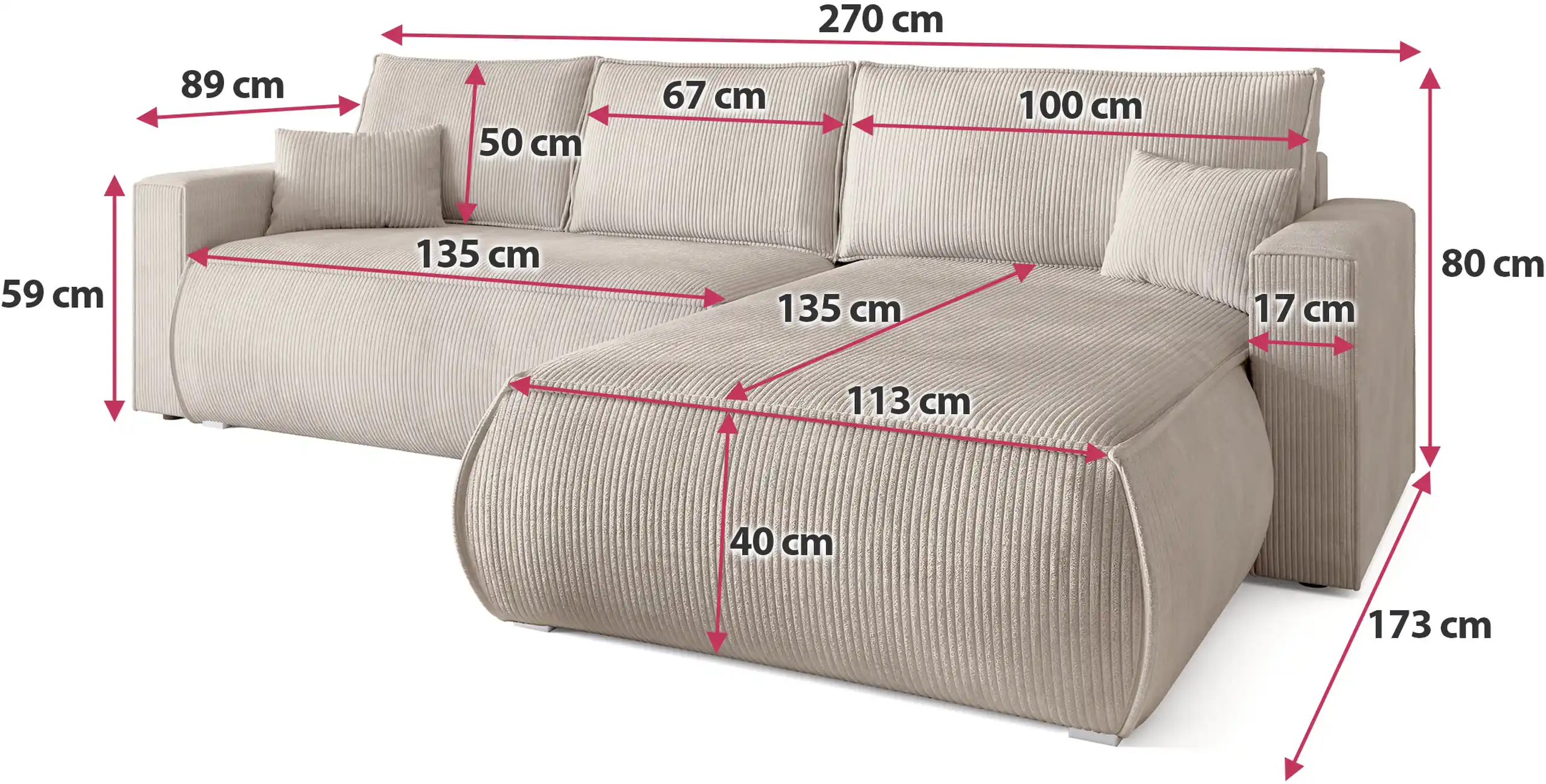 Dzięki funkcji spania o wymiarach 120x236 cm narożnik z łatwością zamienia się w wygodne łóżko. To doskonałe rozwiązanie zarówno dla gości, jak i na co dzień. Wbudowany pojemnik na pościel pozwala na przechowywanie koców i poduszek, pomagając utrzymać porządek w salonie.