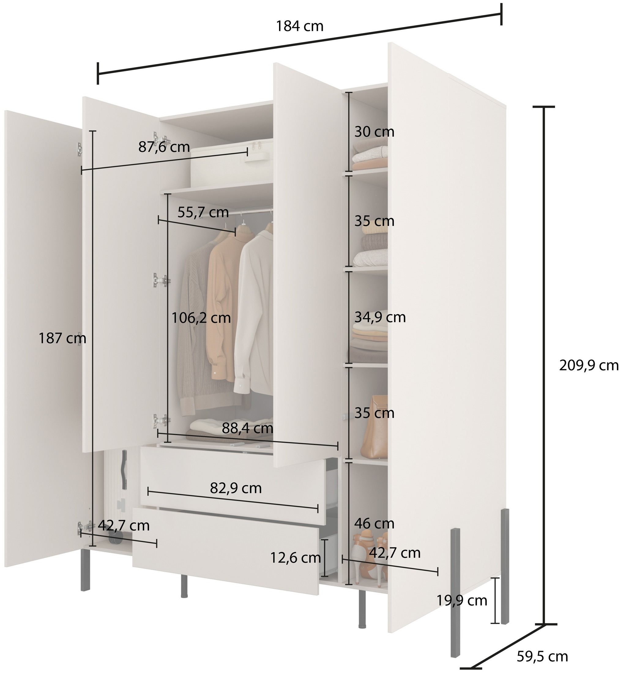 - Wymiary: szerokość 184 cm, wysokość 209,9 cm, głębokość 59,5 cm