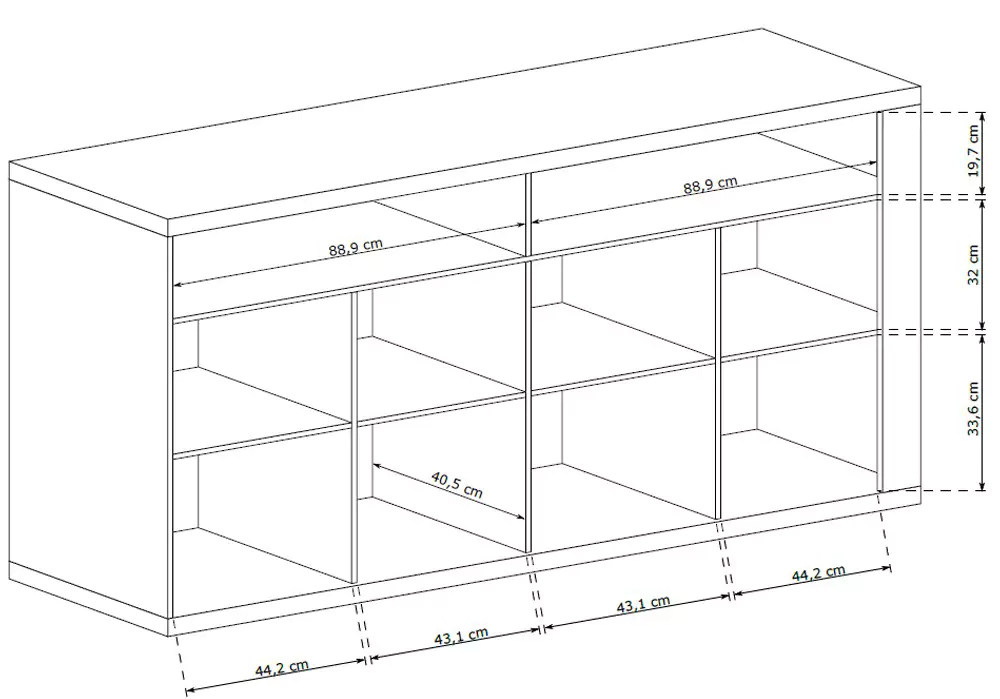 - Korpus oraz front komody wykonano z solidnej płyty laminowanej.