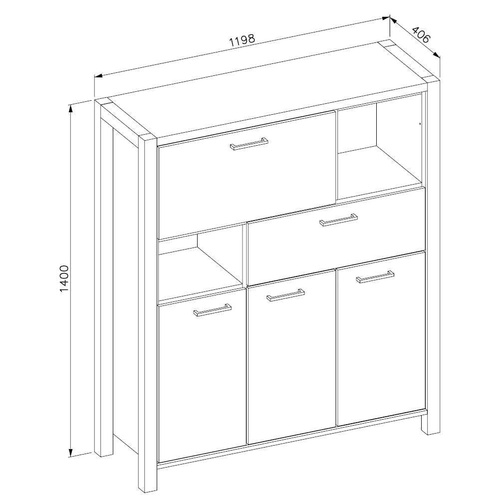 Komoda ANGELINO została wyposażona w troje drzwi, gdzie za każdymi z nich swoje miejsce znalazły dwa poziomy, które doskonale sprawdzą się do przechowywania przedmiotów które chcemy ukryć przed światłem dziennym. Natomiast nad drzwiami znajduje się pojemna szuflada osadzona na prowadnicach kulkowych z pełnym wysuwem, nad którą znajdują się drzwi uchylne typu barek. Dodatkowo komoda posiada uchwyty wykonane z metalu w matowym wykończeniu i kolorze czarnym.