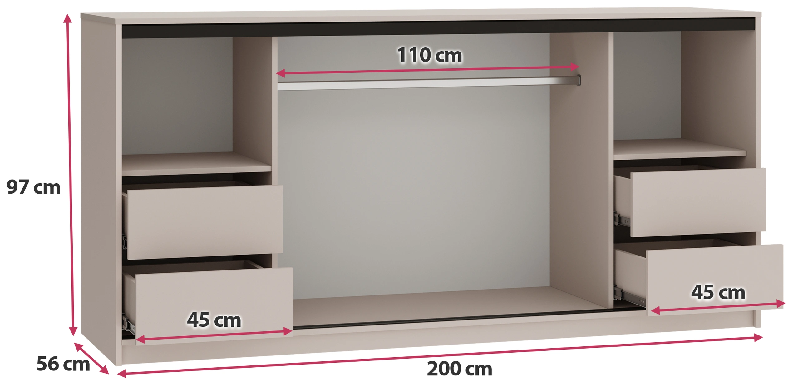 Po lewej i prawej stronie komody znajdują się po dwie pojemne szuflady, które świetnie sprawdzą się do organizacji drobiazgów lub odzieży Nad każdą z nich umieszczono półkę, która oferuje dodatkowe miejsce na większe przedmioty lub dekoracje. W środkowej części mebla znajduje się aluminiowy drążek na wieszaki, idealny do przechowywania ubrań wymagających powieszenia