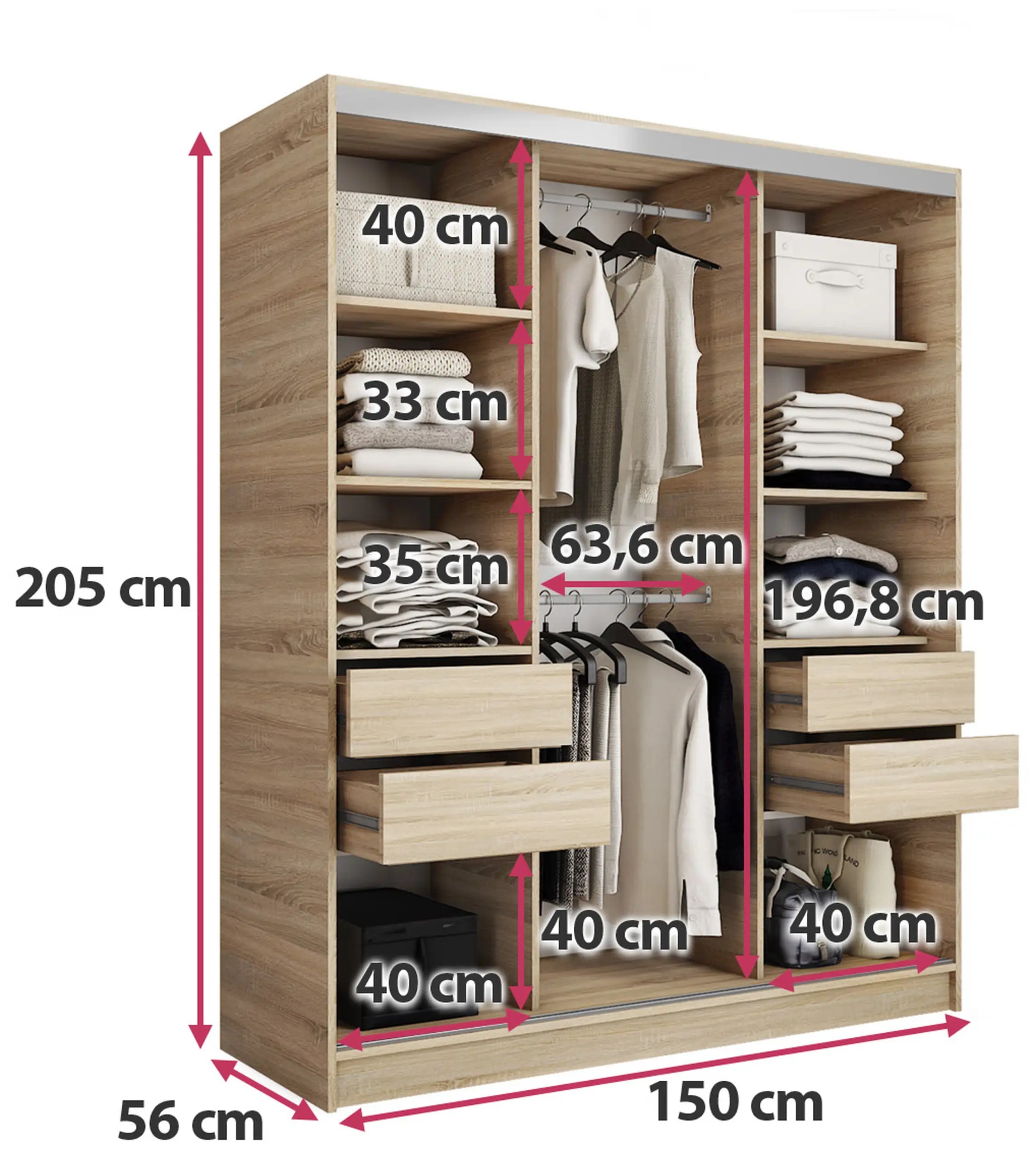 Wszystko się w niej pomieści bez problemu. Nowoczesna szafa przesuwna, prezentuje się bardzo dobrze. Łatwy i szybki montaż. Jednak wyrób z za cienkiej płyty. Przy tych gabarytach płyta 18mm spełniła by swoje zadanie. Płyta 16 mm jest stanowczo za cienka. Mimo wzmocnienia z mojej strony w narożach szafa nie jest stabilna na 100 %. Kolejna kwestia z spowalniaczami do drzwi i szuflad. Niestety ani szuflady ani drzwi nijak się mają do tych udogodnień. Dedykowane przez producenta spowalniacze drzwi nie mieszczą się , a spowalniacze szuflad nie spowalniają. Przyczyna, za ciasno chodzą prowadnice i również nijak się to ma do montażu spowalniaczy szuflady. Czyli zakup bez sensu, a miał ułatwić otwieranie i zamykanie. Reasumując, szafa w tych gabarytach warta tych pieniędzy mimo kilku niedociągnięć. Prezentuje się bardzo dobrze. Zobaczymy jak długo posłuży.