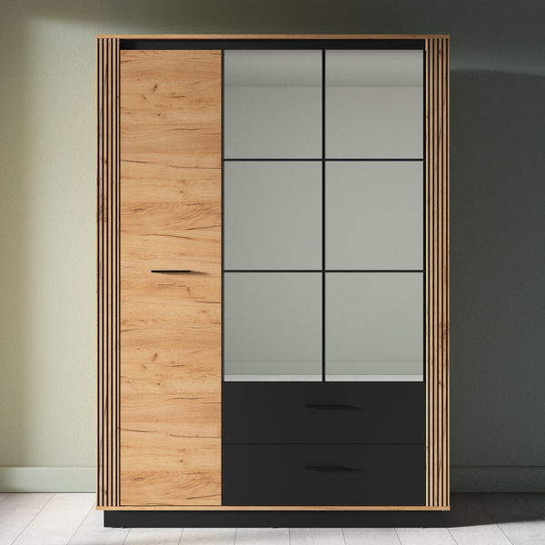 Po lewej oraz prawej stronie szafy znajduje się metalowy drążek na wieszaki z ubraniami, natomiast nad wieszakami znajdują się półki. Szafa przesuwna z lustrem została wyposażona w pięć poziomów pozwalających na rozmieszczenie elementów garderoby oraz akcesoriów czy pudełek. Drzwi szafy poruszają się na solidnych aluminiowych prowadnicach, natomiast jej krawędzie zabezpieczono przed uszkodzeniami mechanicznymi okleiną ABS.