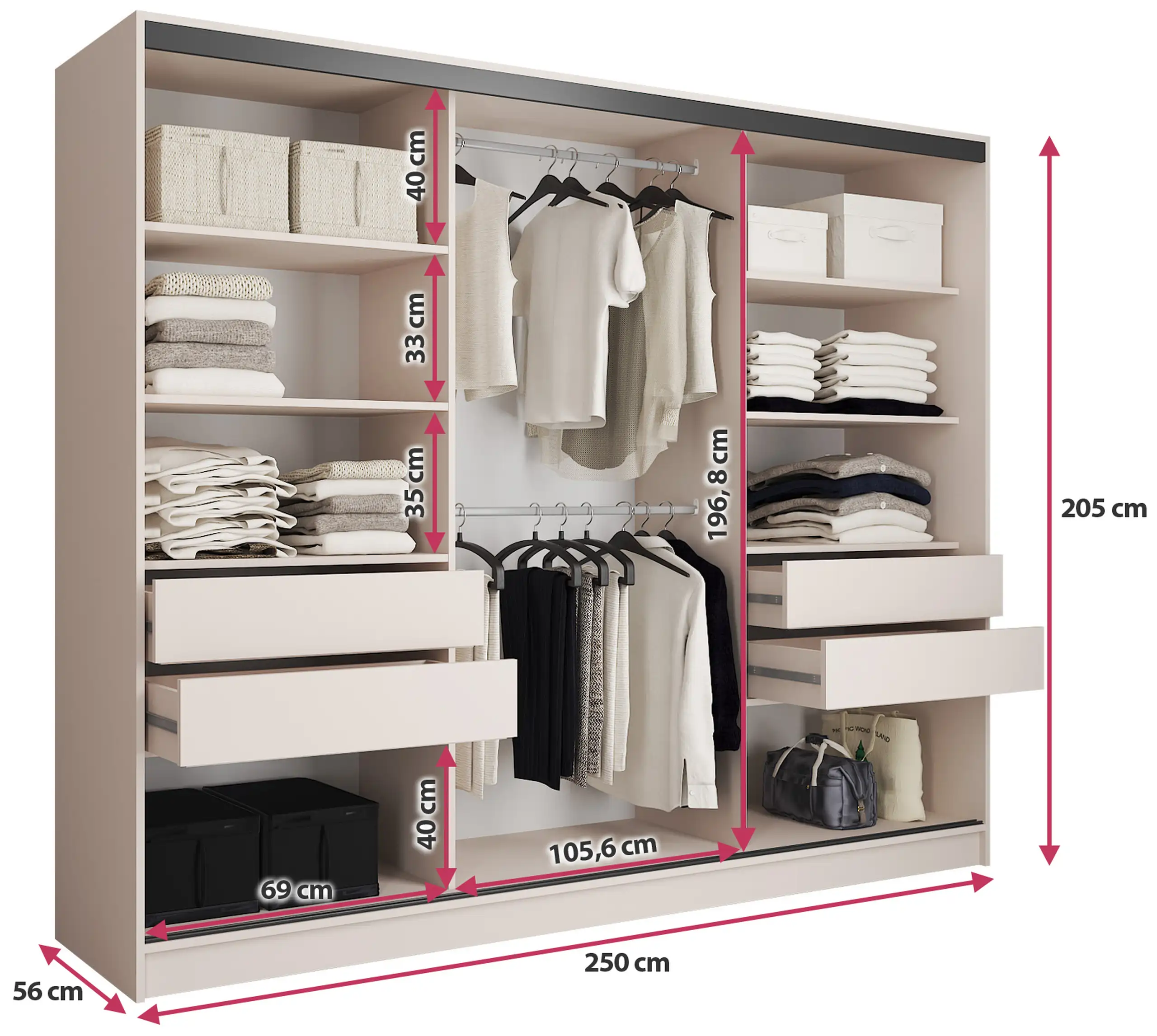 Nasza szafa przesuwna ma szerokość 250 cm i składa się z trzech drzwi, z czego środkowe to lustro, co optycznie powiększa przestrzeń i dodaje wnętrzu głębi. Wykonana została z 16 mm płyty laminowanej, co gwarantuje jej trwałość i odporność na codzienne użytkowanie. Krawędzie szafy są zabezpieczone okleiną ABS, co nie tylko zwiększa jej estetykę, ale także zapewnia dodatkową ochronę.
