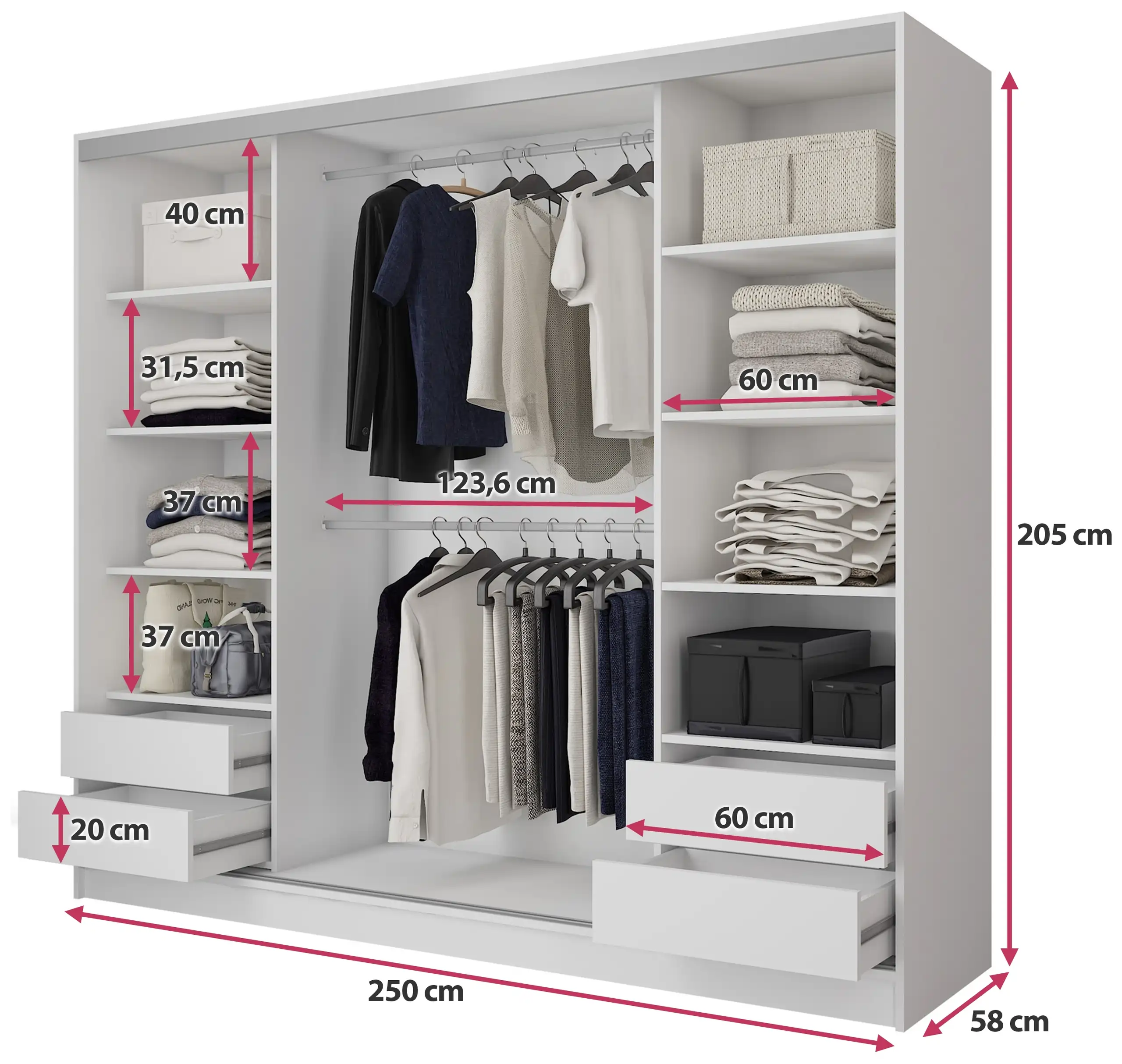 Wnętrze szafy zostało zaprojektowane z myślą o maksymalnym wykorzystaniu przestrzeni.Dwa metalowe drążki na wieszaki, umieszczone na różnych wysokościach, umożliwiają wygodne przechowywanie zarówno długich płaszczy, jak i krótszych ubrań. Dodatkowo,osiem półekzapewnia mnóstwo miejsca na składane ubrania, pościel czy inne przedmioty, umożliwiając zachowanie porządku i łatwego dostępu do potrzebnych rzeczy.