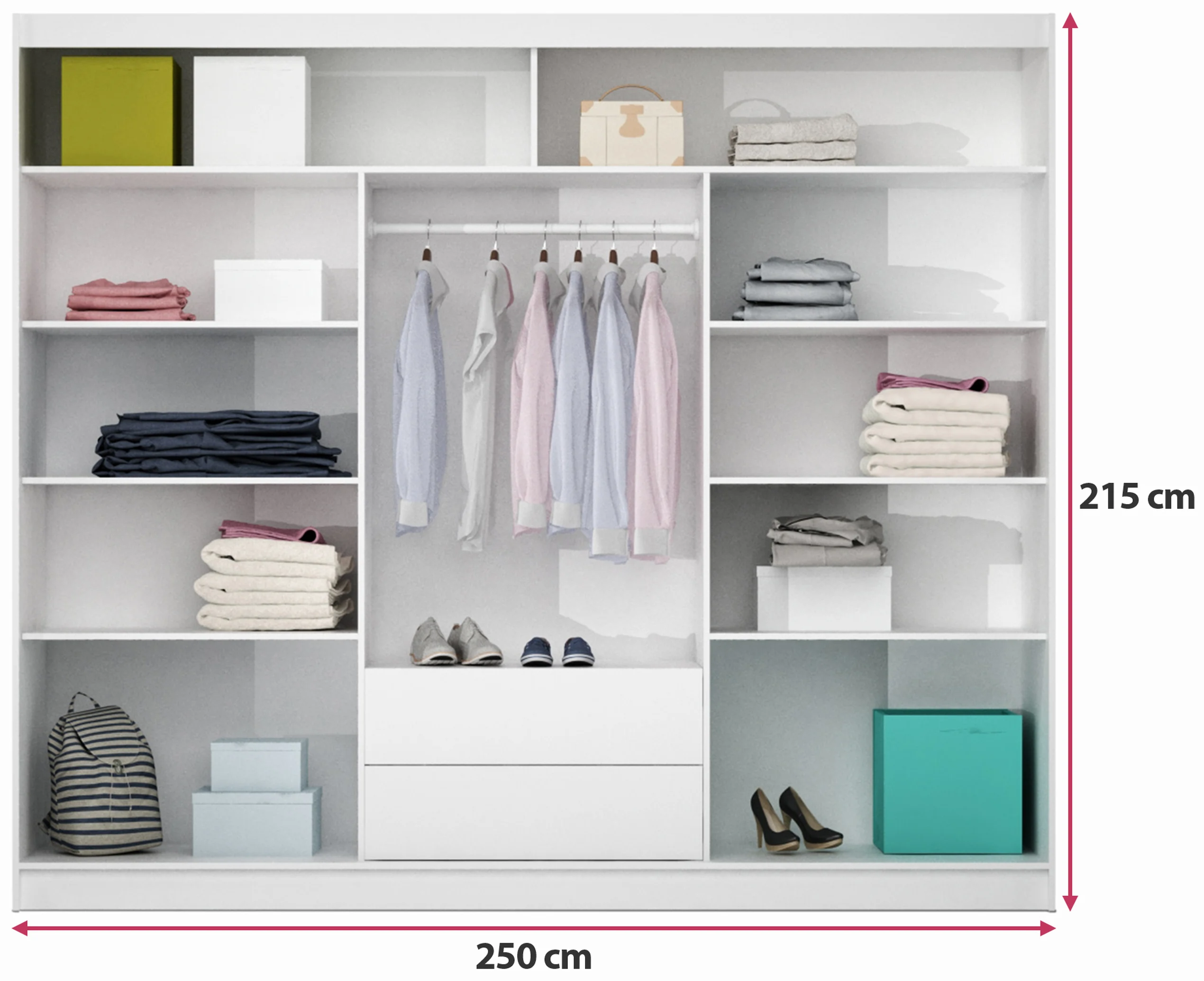 Szafa przesuwna o szerokości 250 cm to doskonałe rozwiązanie dla osób ceniących przestrzeń, porządek i styl. Jej nowoczesna forma oraz funkcjonalny układ sprawiają, że stanie się centralnym elementem każdej sypialni, wnosząc do niej harmonię i praktyczność na najwyższym poziomie.