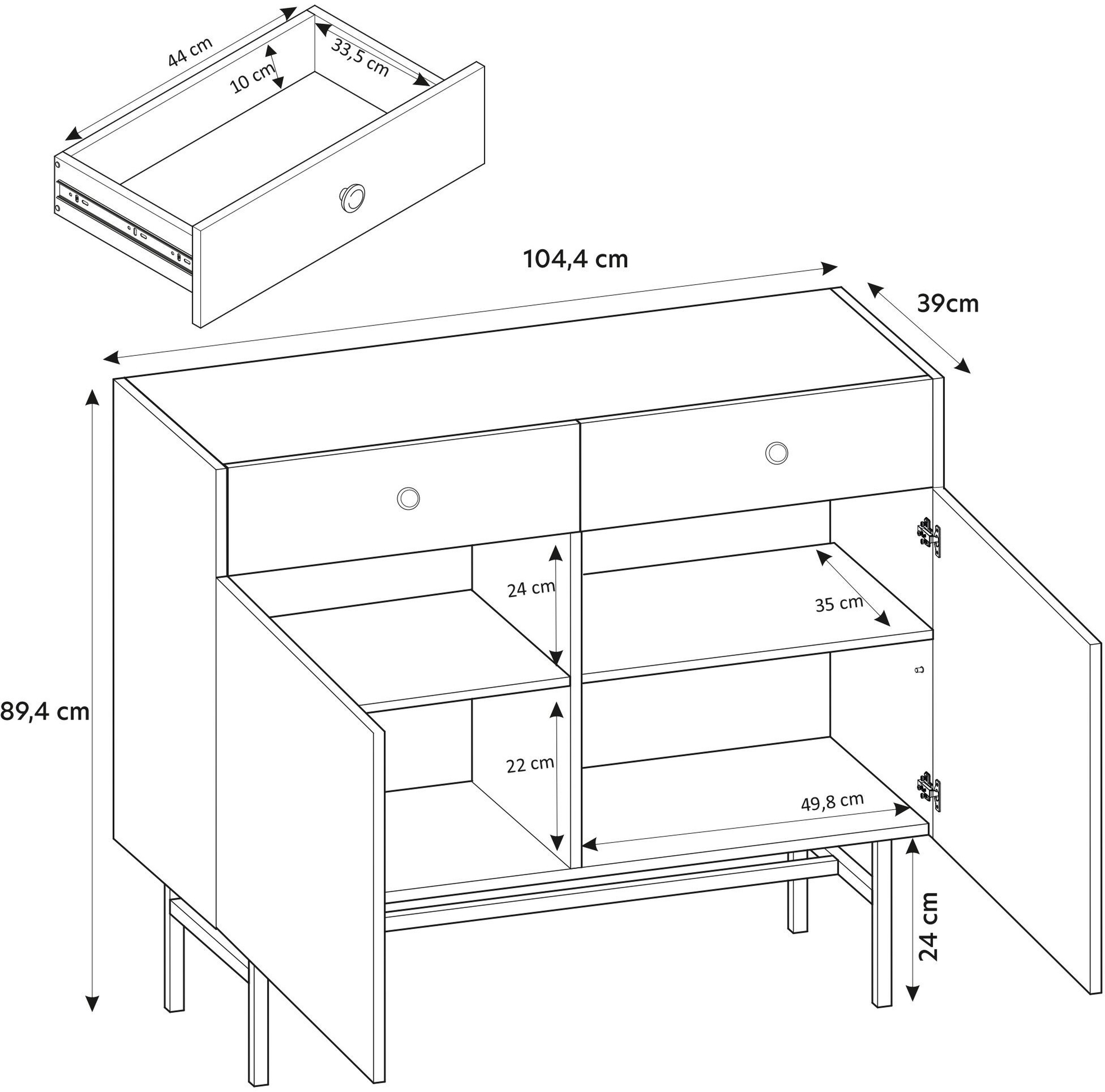 - Wymiary całkowite: szerokość 104,4 cm × głębokość 39 cm × wysokość 89,4 cm