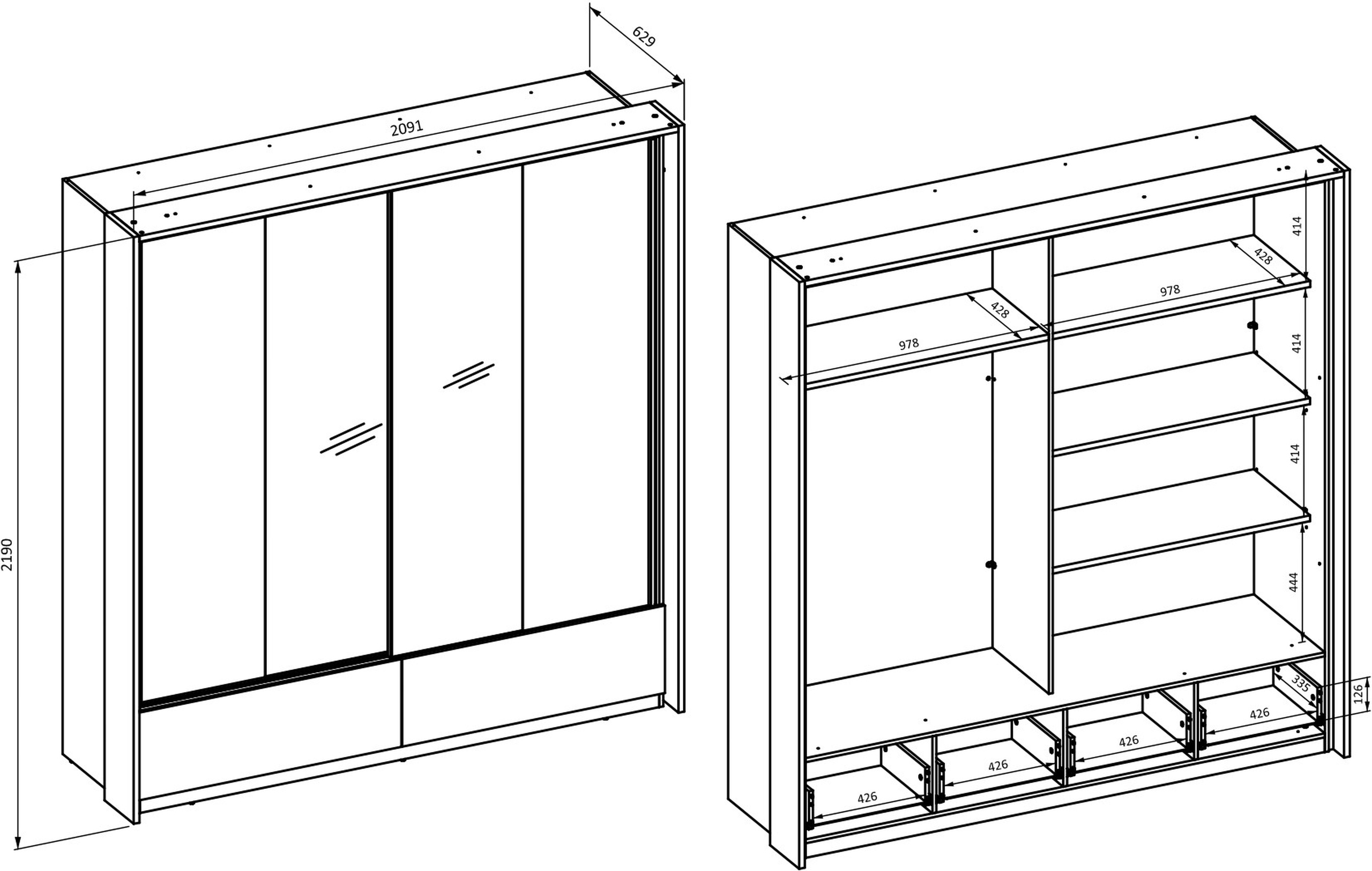 - Wymiary: szerokość 209 cm, wysokość 219 cm, głębokość 63 cm