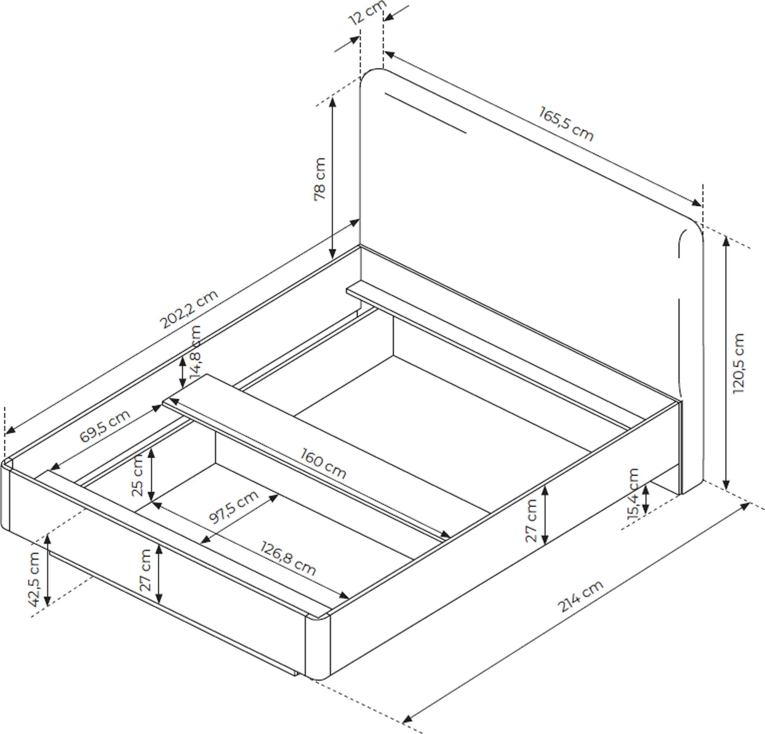 - Wymiary całkowite: 165 x 214 x 120,5 cm (szer. x dł. x wys.)