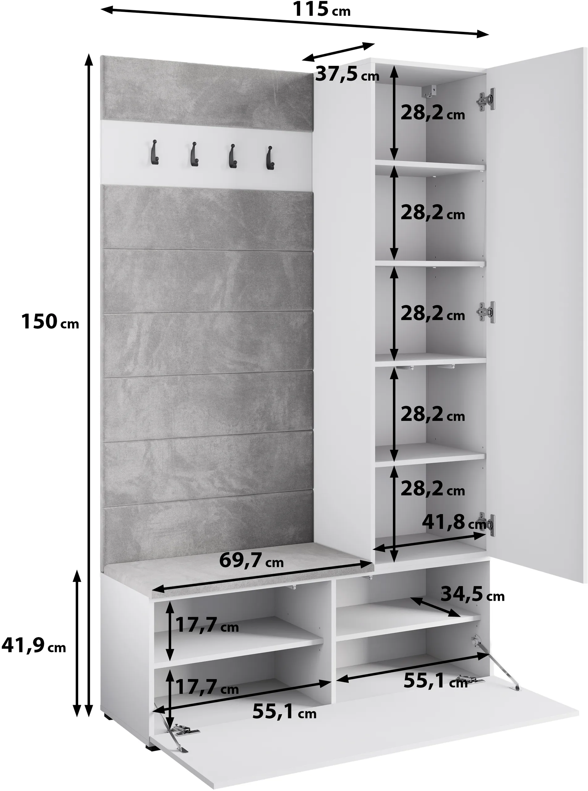 - Wymiary: szer. 115 cm, wys. 150 cm, gł. 37,5 cm