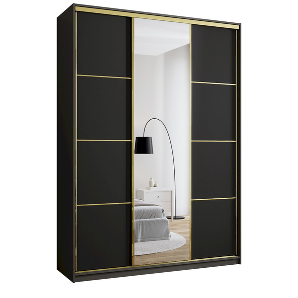 Na centralnych drzwiach szafy znajduje się lustro, które optycznie powiększa przestrzeń, wprowadza do wnętrza więcej światła i pełni praktyczną funkcję codziennego lustra. Dzięki swojej uniwersalnej stylistyce szafa świetnie wpasuje się w aranżację zarówno nowoczesnych sypialni, jak i przestronnych garderób.