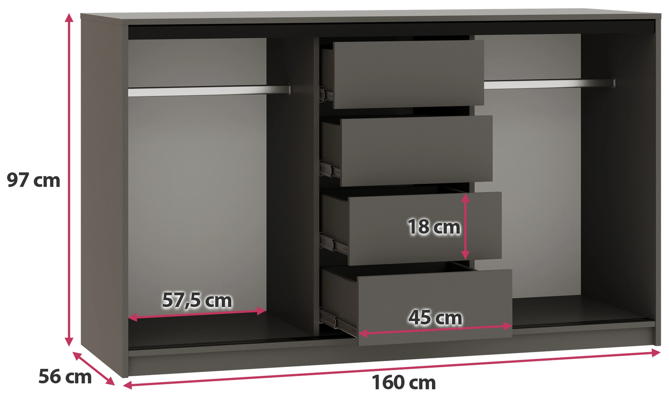 Komoda LOFT oferuje doskonałą organizację przechowywania. Po lewej i prawej stronie znajdują się dwa aluminiowe drążki na wieszaki, które pozwalają na wygodne przechowywanie odzieży wymagającej powieszenia. Środkowa część została wyposażona w cztery szuflady na prowadnicach kulkowych, które poruszają się płynnie i bez wysiłku, umożliwiając łatwy dostęp do przechowywanych rzeczy