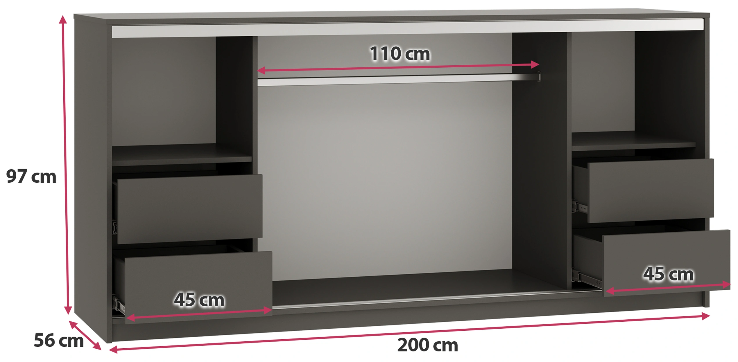 Po lewej i prawej stronie komody znajdują siępodwie przestronne szuflady, które są idealne do przechowywania mniejszych przedmiotów lub odzieży. Nad każdą szufladą umieszczono półkę, która oferuje dodatkowe miejsce na większe przedmioty, organizery lub dekoracjeŚrodkowa część komody została wyposażona w aluminiowy drążek na wieszaki, co czyni ją idealnym rozwiązaniem do przechowywania ubrań wymagających powieszenia