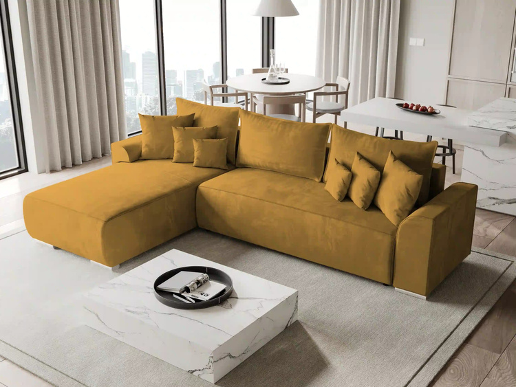 - Kanapa narożna wyposażona w niezwykle praktyczny pojemnik na pościel, który w tym modelu umieszczono pod wysuniętą leżanką.