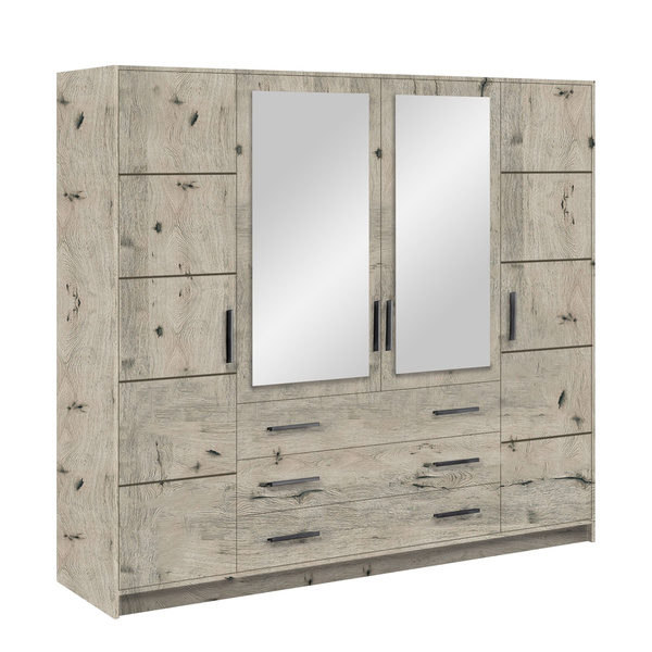 Centralna część szafy została wyposażona w drążek na wieszaki, umożliwiając przechowywanie ubrań wymagających odpowiedniego ułożenia. Dwie pojemne szuflady idealnie sprawdzą się na drobniejsze elementy garderoby lub bieliznę. Po bokach, za stylowymi drzwiami z lamelami, ukryto aż dziesięć półek, oferujących mnóstwo miejsca na swetry, koszulki i dodatki.
