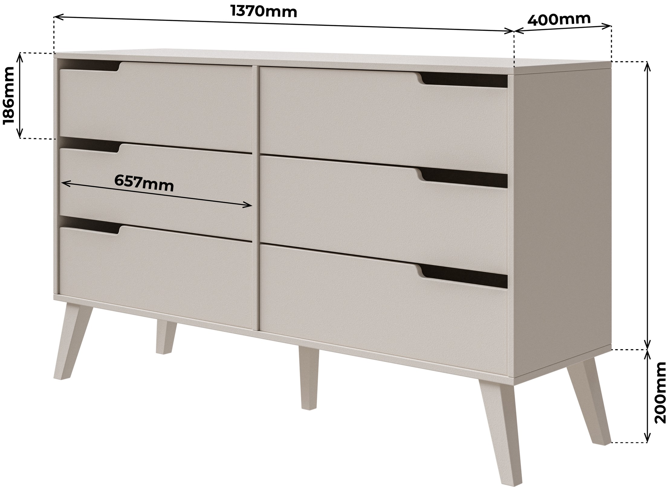 Komoda z szufladami NIVARO to perfekcyjne rozwiązanie do przechowywania, które łączy elegancję, funkcjonalność i nowoczesne wzornictwo. Dzięki aż sześciu pojemnym szufladom z łatwym dostępem, mebel świetnie sprawdzi się w sypialni, garderobie, salonie lub przedpokoju. Jej jasny, kaszmirowy kolor i wysokie drewniane nóżki wprowadzają do wnętrza lekkość i harmonię.